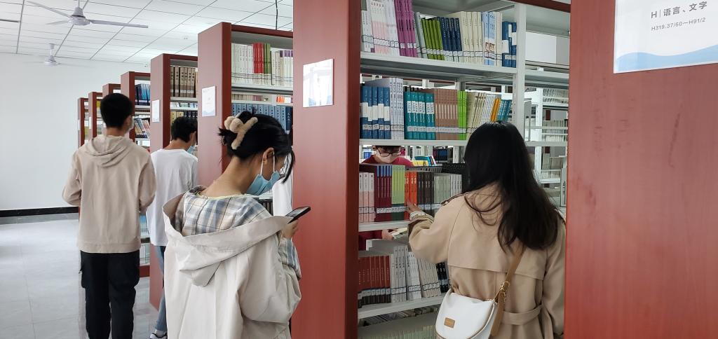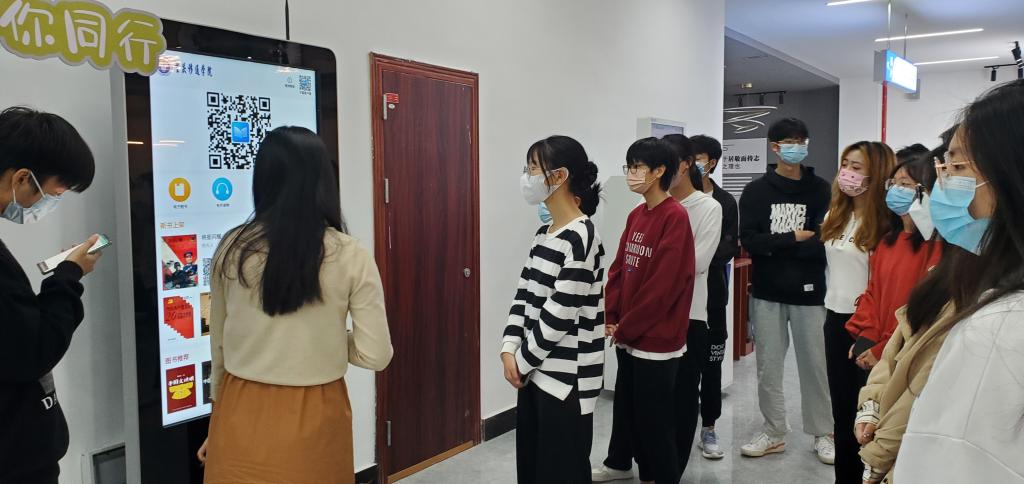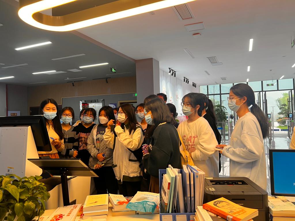 接着,了解如何检索馆藏纸质书籍也是十分重要的,在图书馆这个书籍琳琅满目的地方,找不到自己感兴趣的图书是一大难题,不必担心的是图书馆为大家很好的解决了这一问题,陈柳老师讲到一台电脑即可实现快速定位自己感兴趣的书籍在哪个楼层。除了检索书籍的电脑,图书馆还有电子书瀑布流、电子书借阅机等。谁曾想,移通学院也有自己的瀑布,这个瀑布没有“虚空落泉千仞直,雷奔入江暂不歇”的磅礴,而是一本本诗书缓缓流动,点击后扫码即可获得电子版阅读,还可听书,这真是手机党的一大福音。到达二楼,老师们为同学们讲解完图书陈列方式后,又讲到图书馆是大学陪伴同学们最久的地方,希望大家能利用好这个平台多读书、多学习,多充实自己的大学生活,做更完满的自己。一讲完同学们迫不及待地去找寻借阅图书,像一条条小鲸鱼自由徜徉在书籍的海洋里,寻找着自己感兴趣的图书,空气中弥漫着满满的书香气!