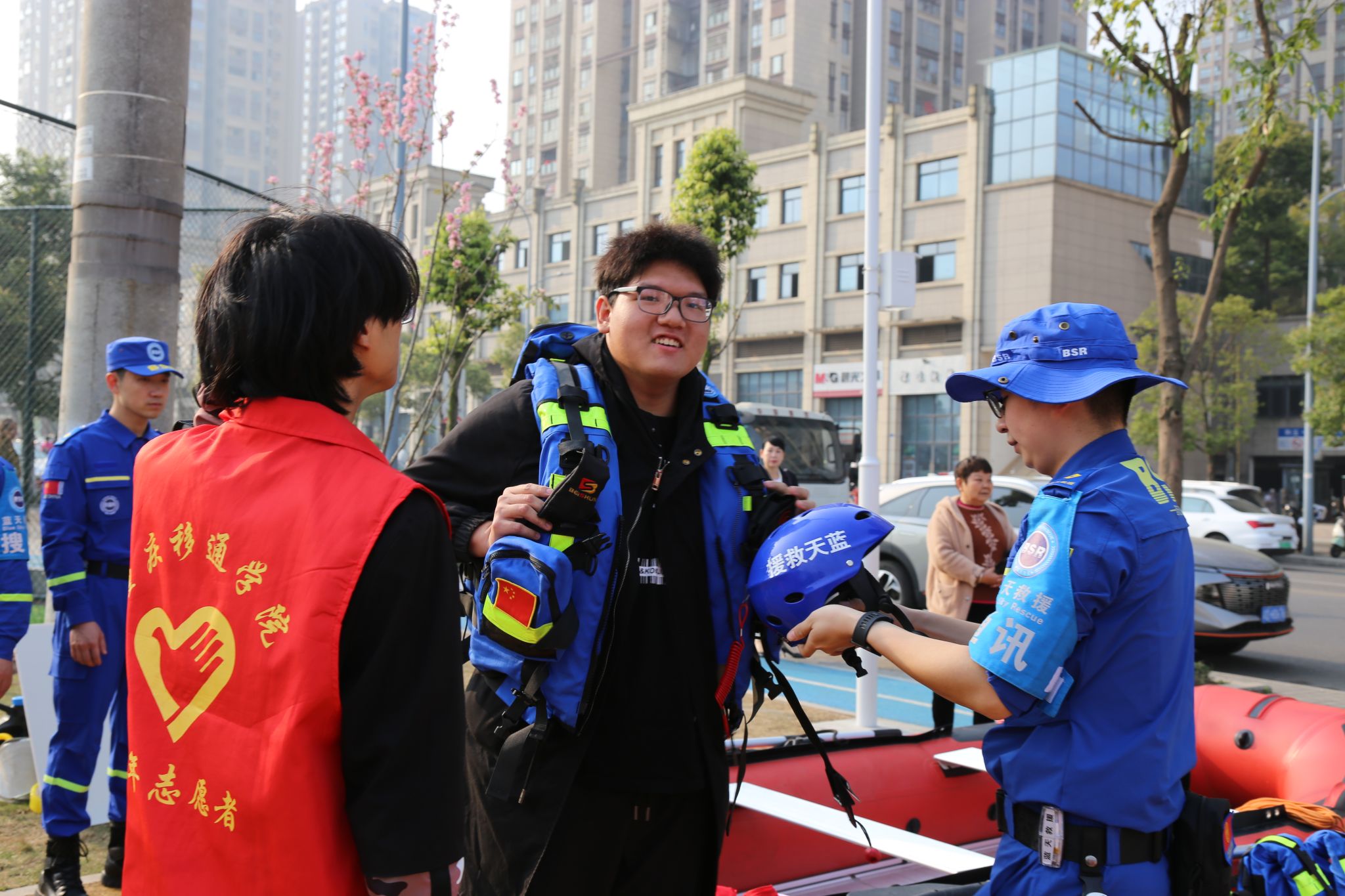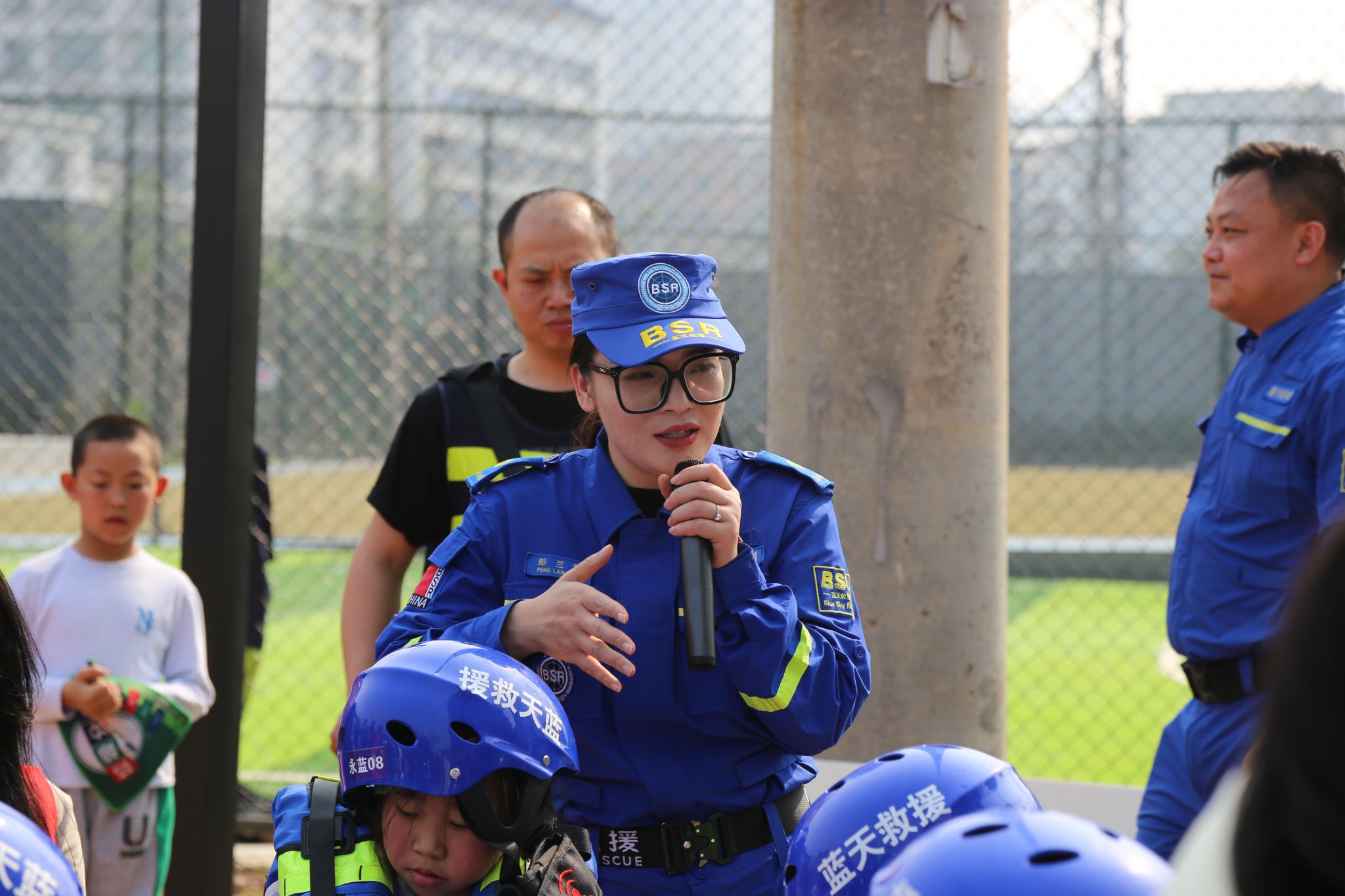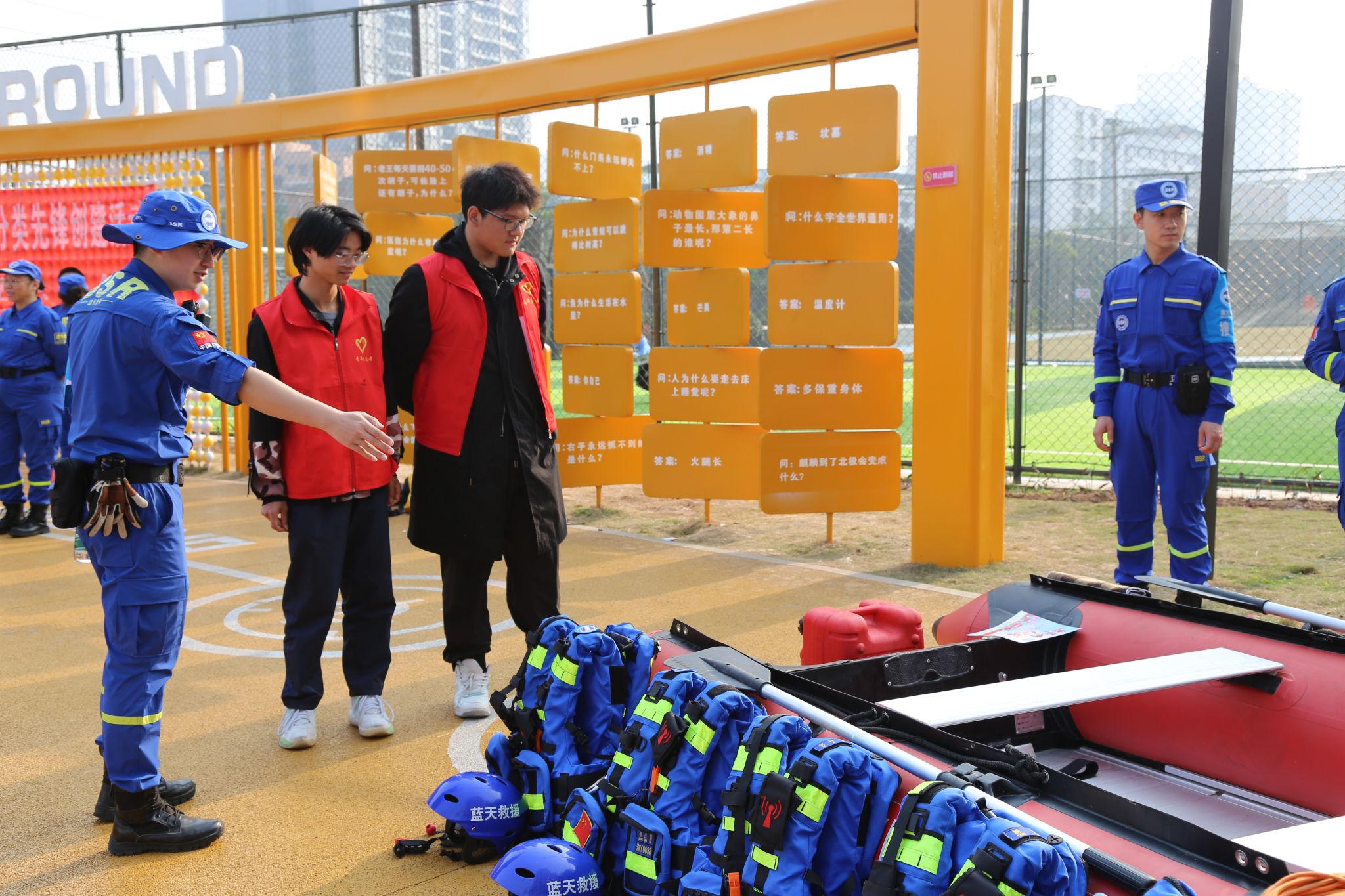 本次活动由重庆移通学院计算机学院辅导员兼永川区蓝天救援队秘书组组长彭兰萱担任主持。讲师团队包括永川区蓝天救援队副队长杨炀,负责讲解绳结使用及简易担架制作;永川区蓝天救援队装备组组长唐亮,负责讲解山火装备的穿戴及使用方法、火场逃生技巧(湿毛巾的使用)以及防踩踏知识;永川区蓝天救援队装备组组长张庆雪,负责讲解救生衣等水域救援装备的穿戴及使用方法、皮划艇的使用技巧及用途,以及溺水预防方案。
