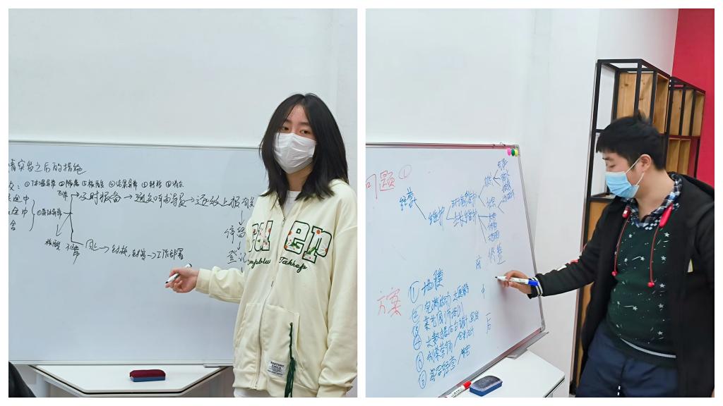 疫情席卷綦江,在紧要关头,危机期间,应当有非常之举。第五期焦点圆桌会以校园封控为背景,使参与者站在校方角度开展在疫情之下如何有序进行校园管理的主题讨论。在讨论激烈时,两组拾起白板,铺上圆桌,六人相围,群情激昂,颇有指点江山之意。