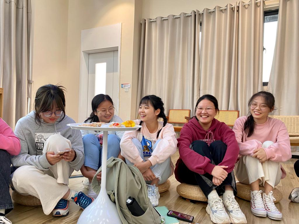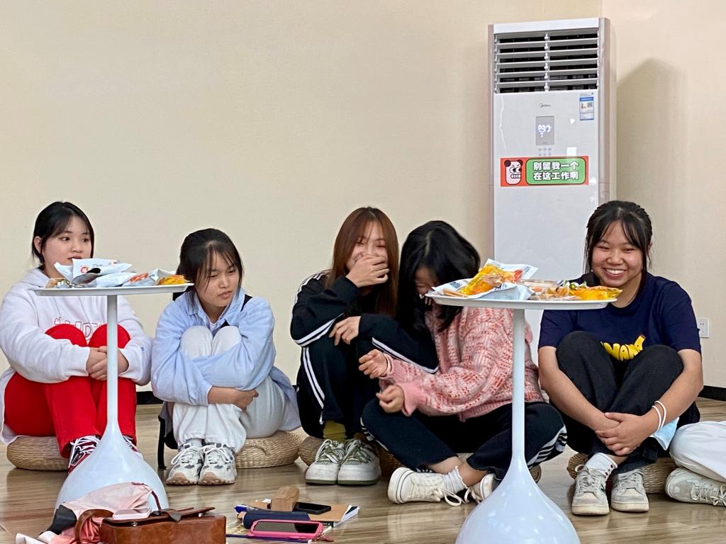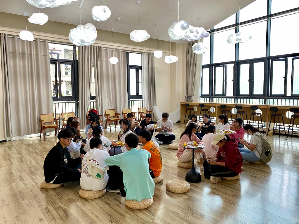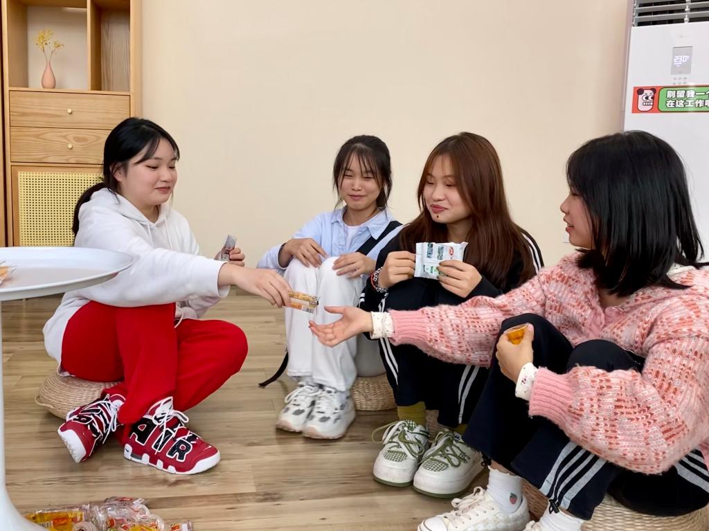 走进云里发呆室,眼前别具一格的房间布置和琳琅满目的零食让很多同学不禁“捂嘴式吃惊”,曾老师引导大家随意享用零食。同学们三个一组、五个一群自由围坐,与好友一同吃起了零食唠起了磕,脸上都洋溢着灿烂的笑容。