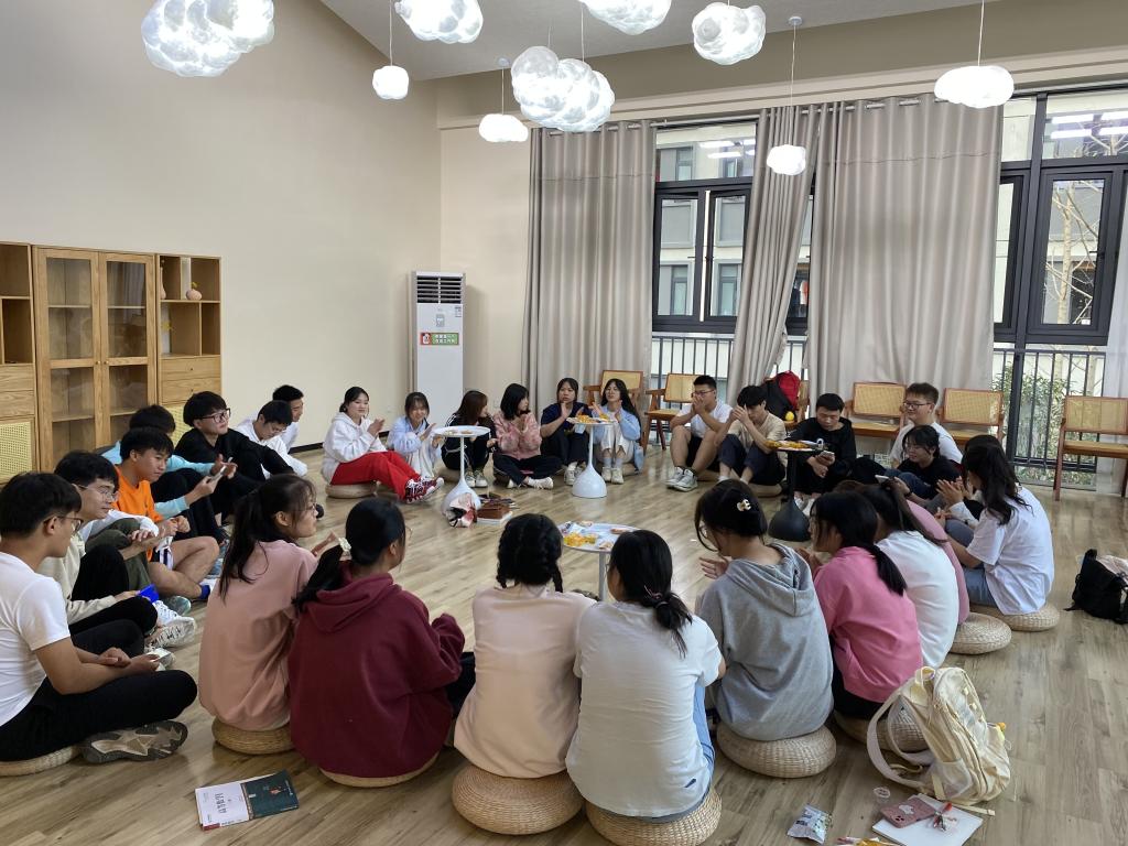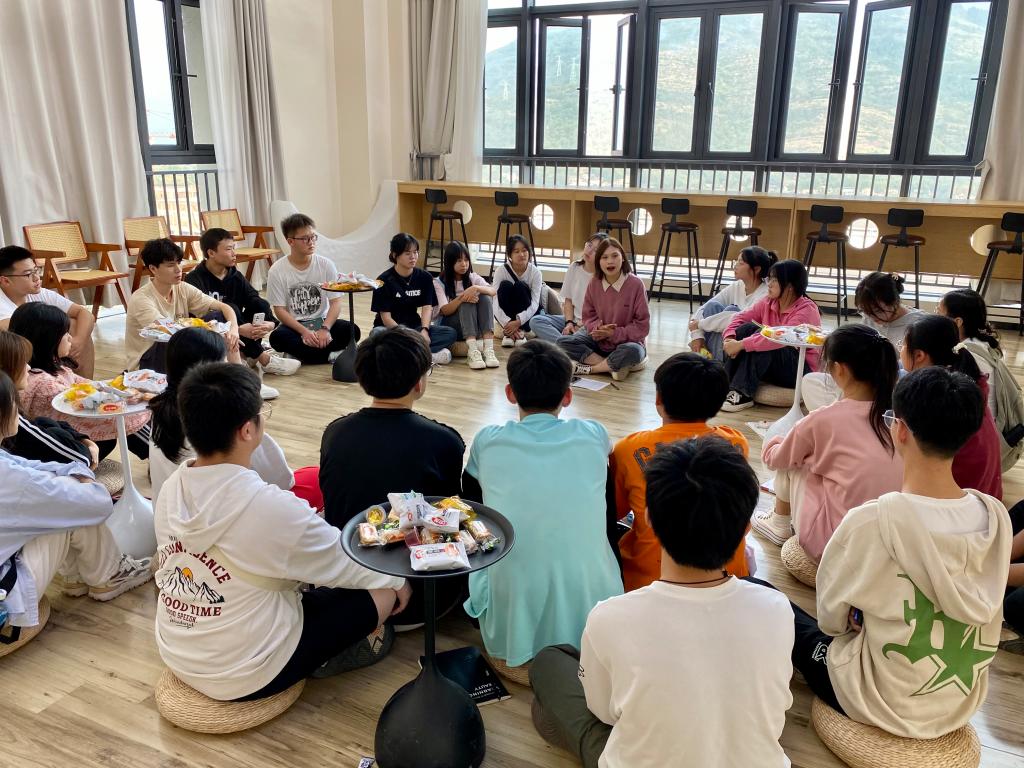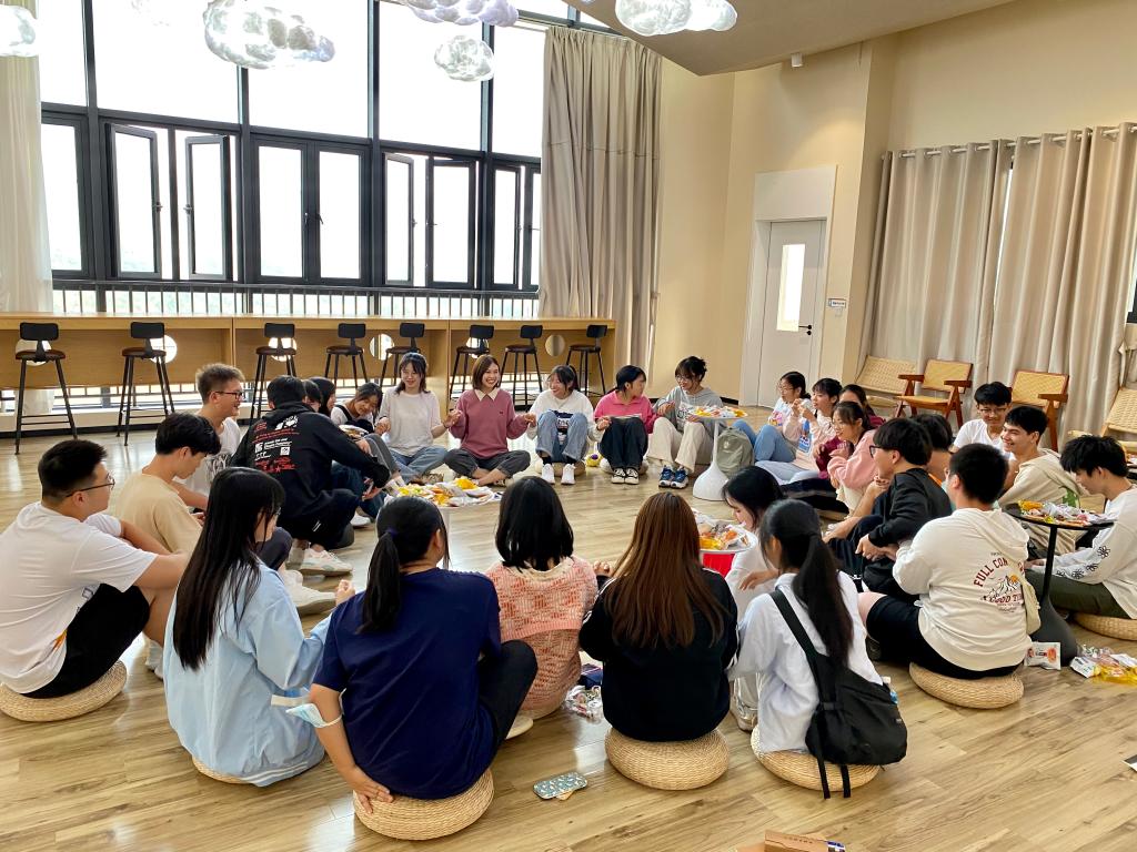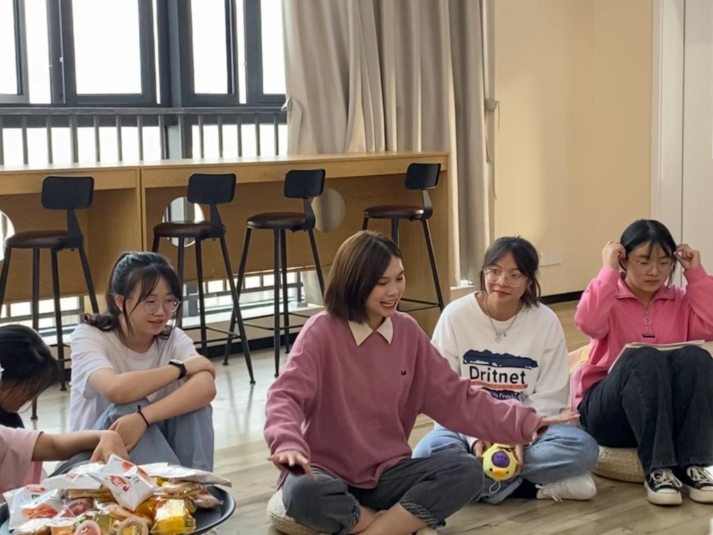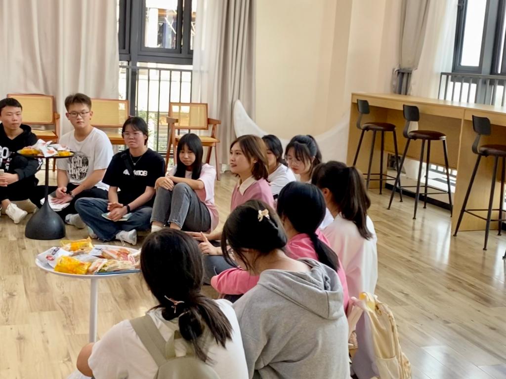 走进云里发呆室,眼前别具一格的房间布置和琳琅满目的零食让很多同学不禁“捂嘴式吃惊”,曾老师引导大家随意享用零食。同学们三个一组、五个一群自由围坐,与好友一同吃起了零食唠起了磕,脸上都洋溢着灿烂的笑容。