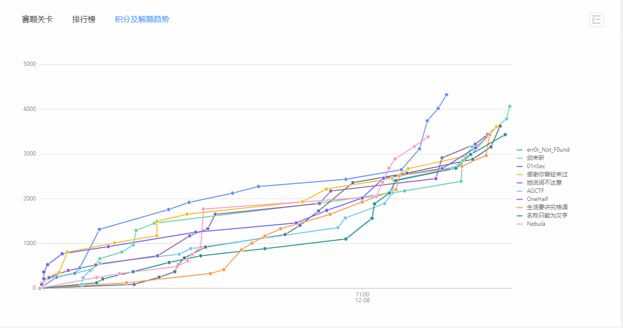 线上初赛历时3小时,从9:00开始,至12:00结束。随着时间的推移,对战进入了关键阶段,排名顺序不断变动,最高分持续被刷新。下面这张解题趋势图,如实记录了竞赛过程中的激烈程度。