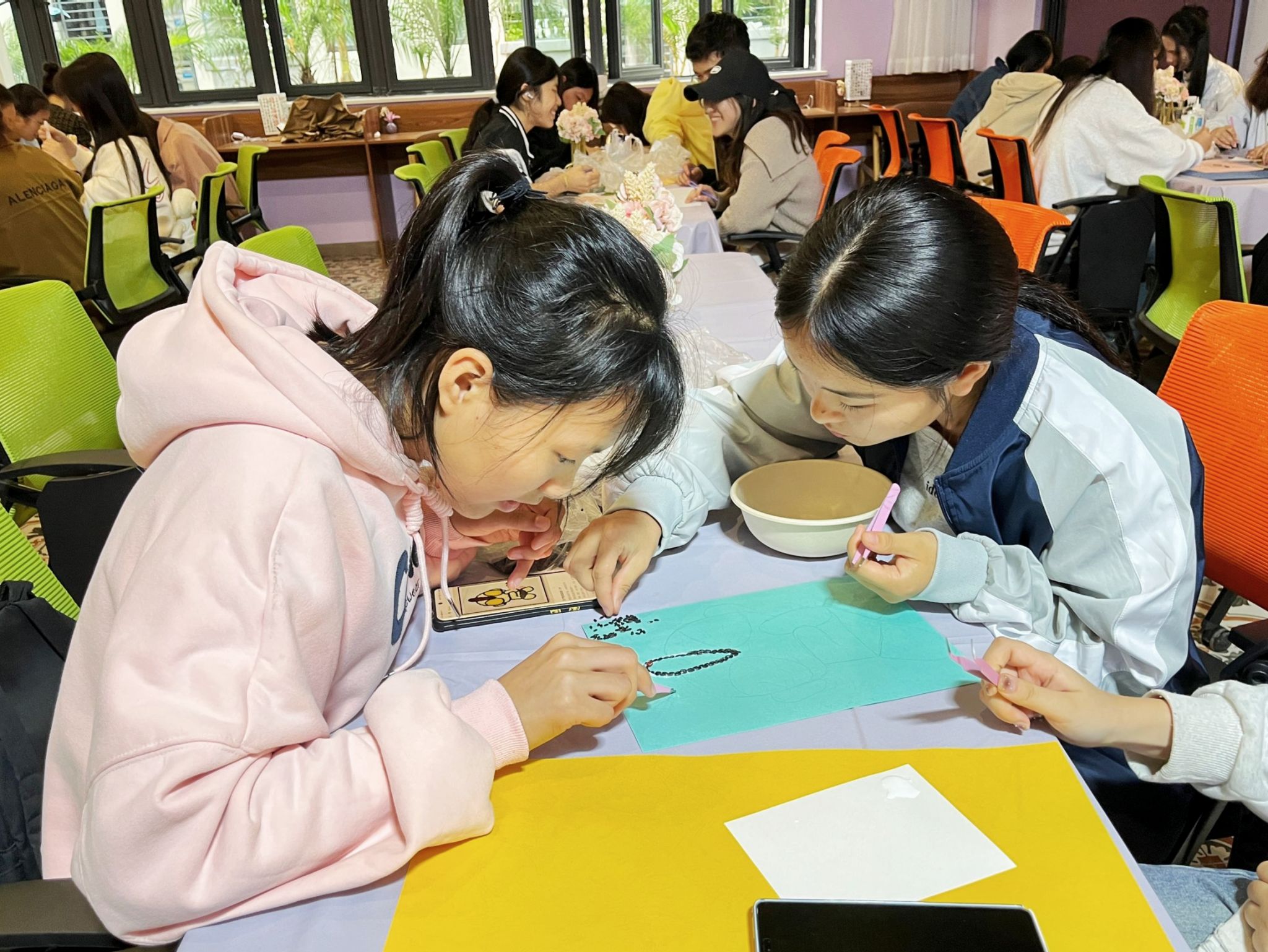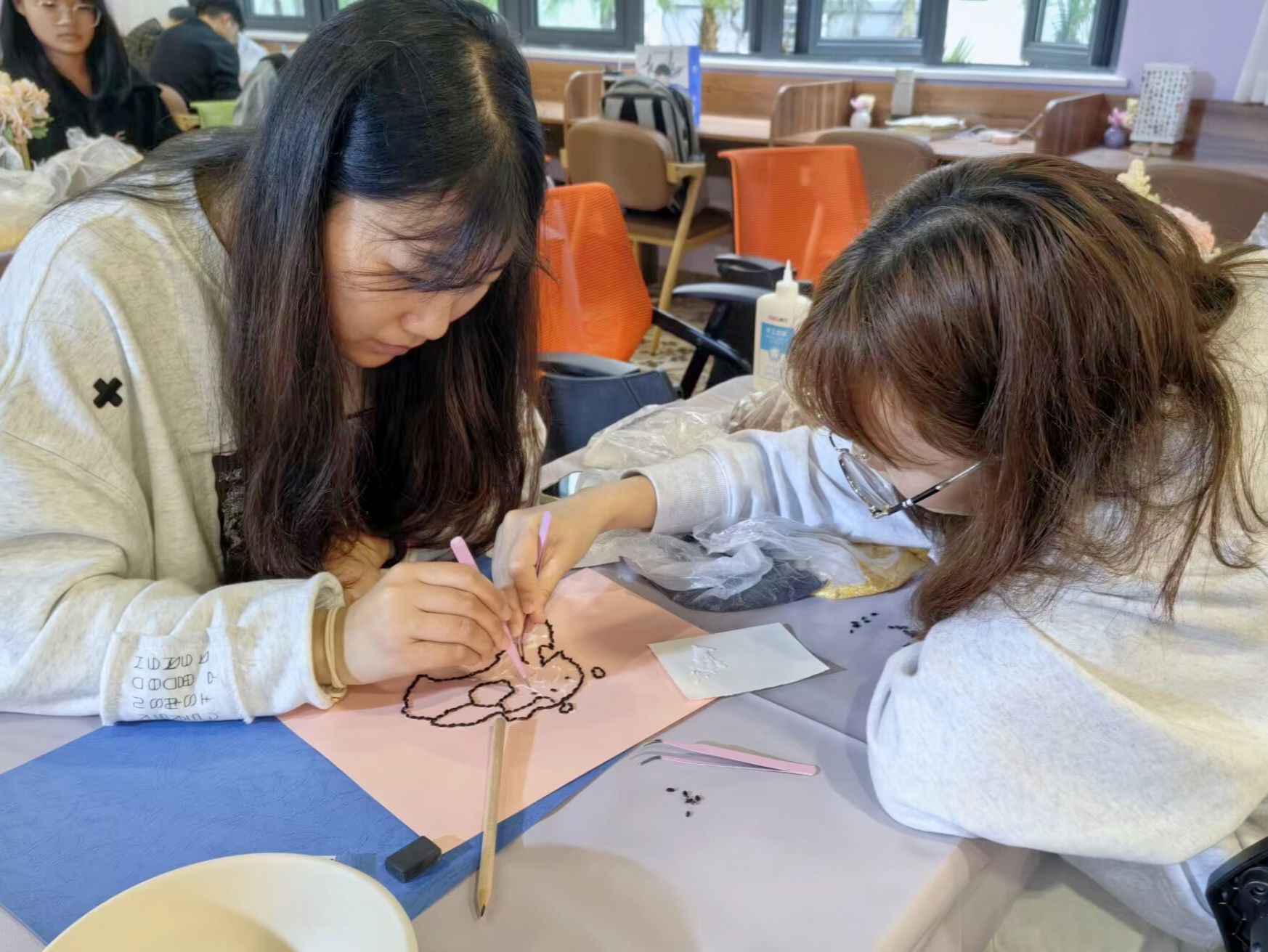 活动伊始,同学们便摩拳擦掌,动起手来。活动三人一组,每个小组都有自己的工作区域,桌上摆放着各类工具和一系列五谷杂粮。同学们有序地分工合作,有的同学积极查找心仪的图案,有的同学在卡纸上勾勒出图案的轮廓,还有的同学负责将五谷杂粮分类整理填充,确保每种杂粮都能被充分利用。