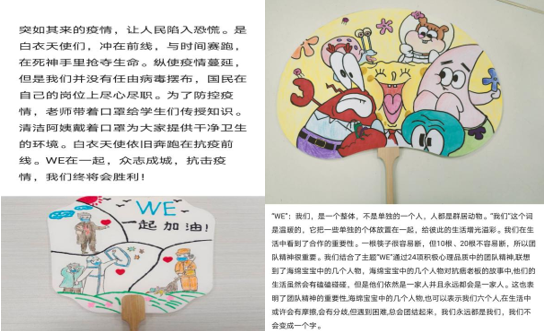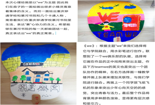 心理绘画是以非语言形式表达个体情感的重要方式,继以“初见”为主题的首届心理绘画活动开展后,表达性艺术疗法在我校的心理活动中被广泛应用,因其不受语言、年龄、认知能力、绘画技巧等方面限制的特点,深受广大师生喜爱。本次心理绘画大赛以“WE”为主题,主题中文意为“我们”,发音同“喂”,打招呼的意思,旨在让我校师生与他人协同合作,产生思想碰撞,以色彩表达情感,以笔触搭建友谊,在创作中展现个人魅力,培养团队精神。本次心理绘画大赛创新作品呈现形式,以扇作画,给予师生美的感受的同时增强实用性,将艺术与生活实际相结合,正如艺术疗愈中提到艺术作品的创作、欣赏和使用过程本身就具有一定的疗愈作用。