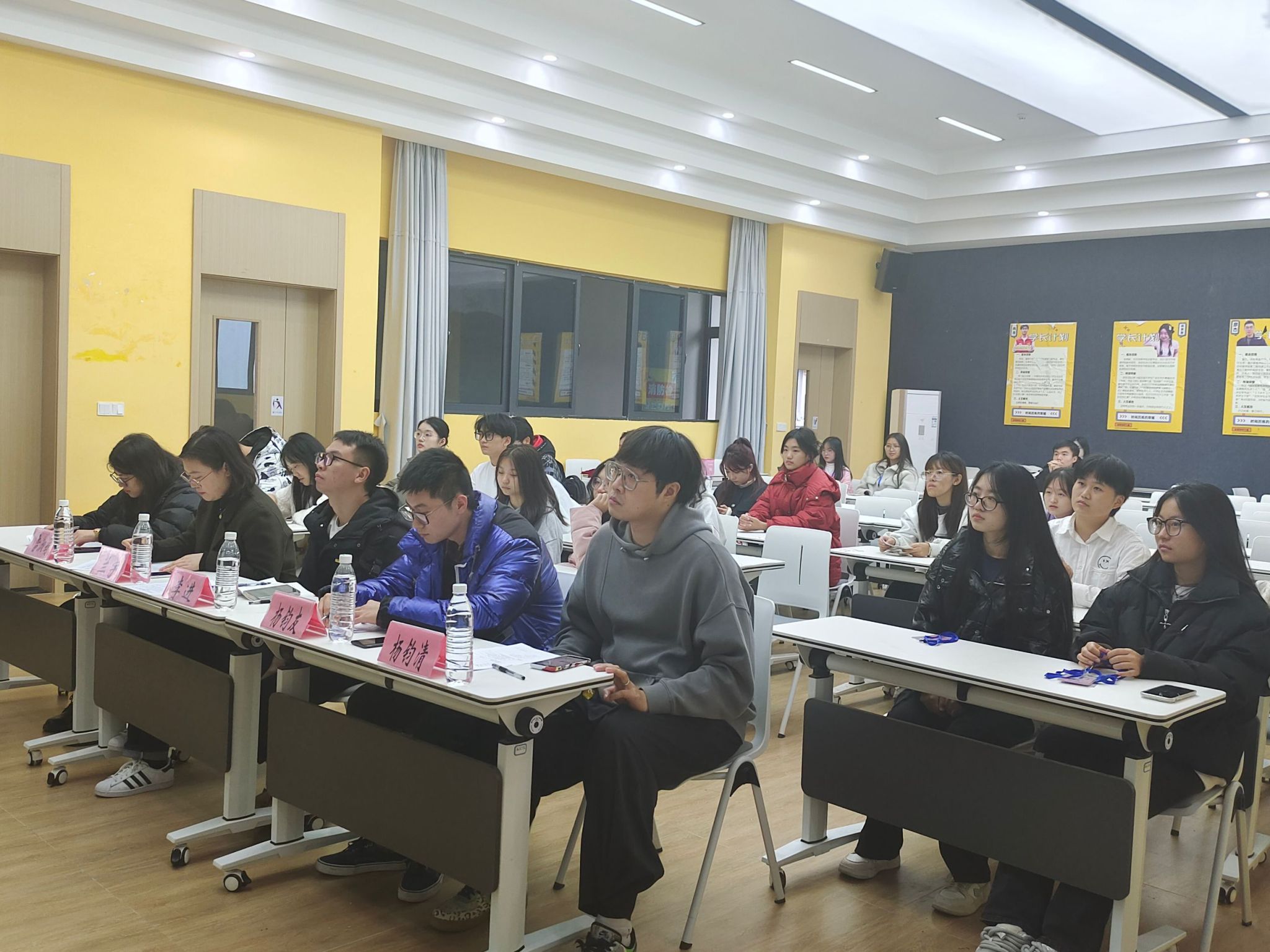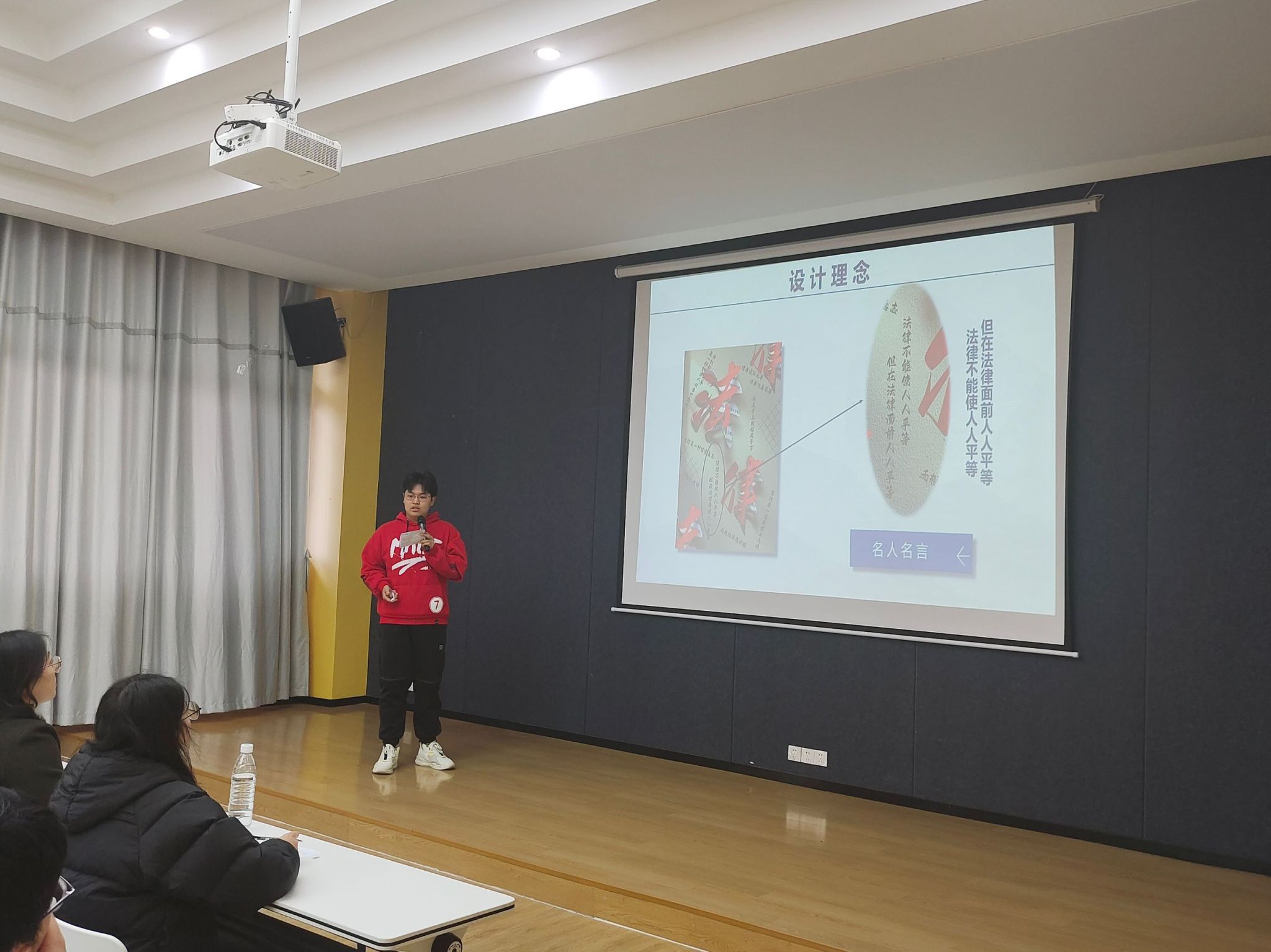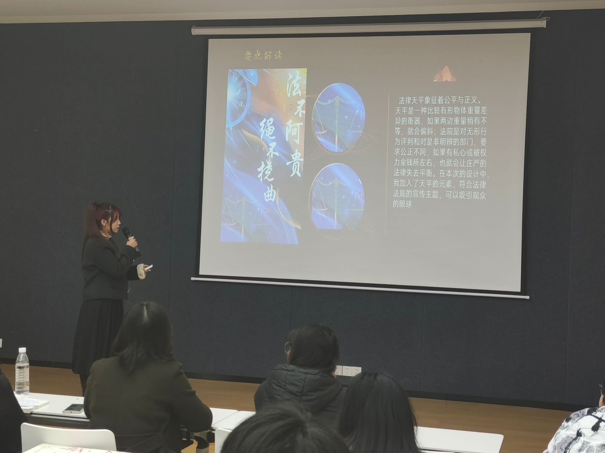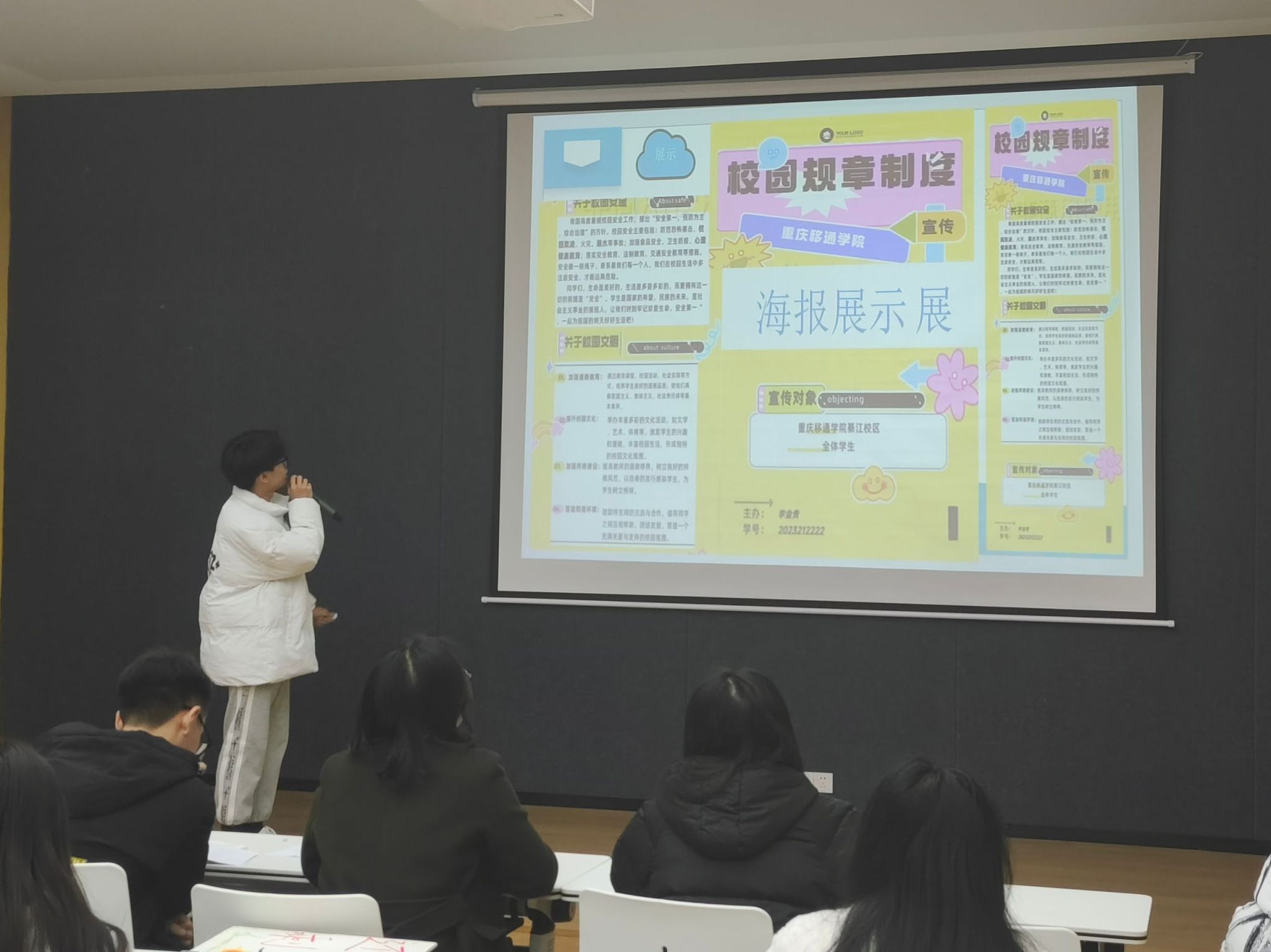 接下来,每组参赛人员将分别从校园规章制度(安全,文明等),社会道德法律,与生活权益三个主题轮流开始讲解自己的海报作品,评委老师将从内容、主题、创意、美观性以及表现力等方面进行评分。同学们用他们的创新思维去打动评委老师,去述说他们独特的想法意图。