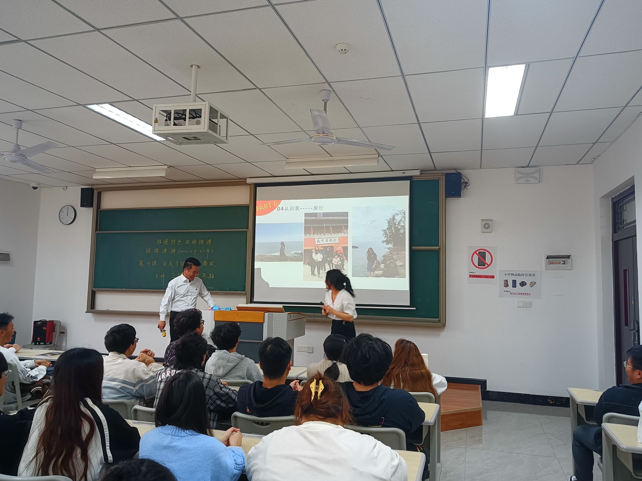 9日下午七八节,仁者楼301教室,上课的同学们陆陆续续走进来,发现创意写作学院王恒绩老师和电影评论中心的梁冬梅老师并肩站在讲台上,一脸亲和的微笑,这画面让同学有些懵。坐在第一排的苏韦安同学与邻座窃窃私语:“怎么,本课要换老师了?是来办交接手续的吗?”答案当然是NO,本课今天进行的就是双师授课,本意是打破传统教学模式,由一个人的独角戏变成双人舞。同学们的表情,瞬间就点亮了,有新意!