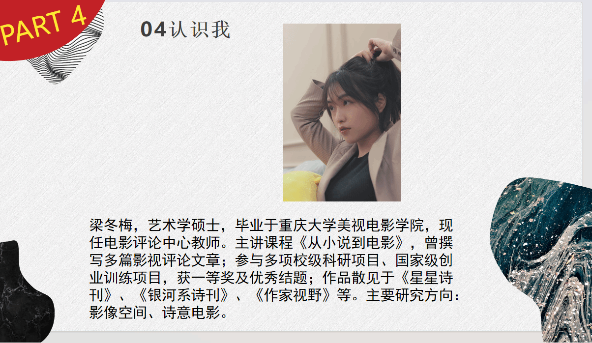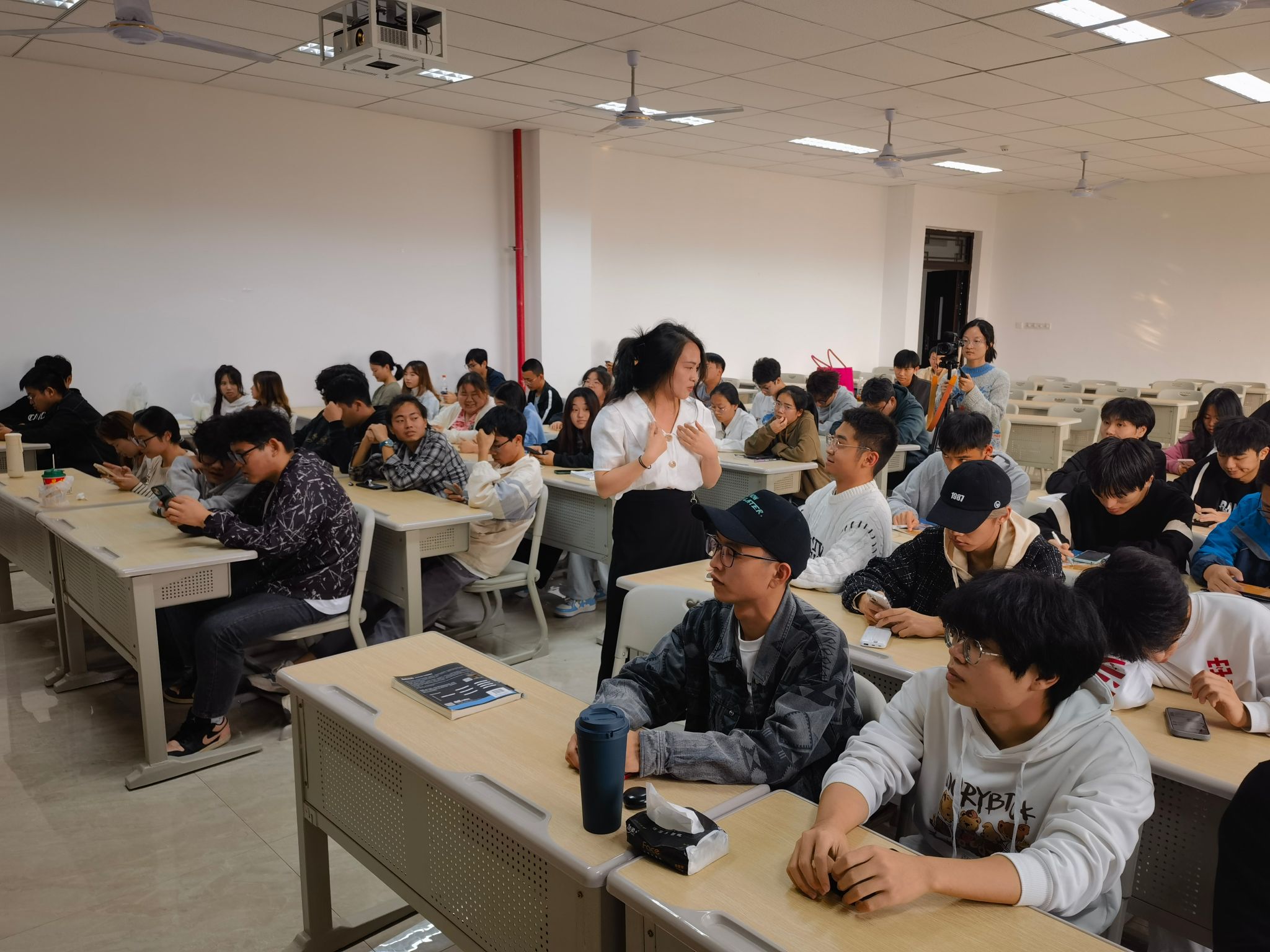 梁老师接着抛出一系列不同年龄段的照片,有她的叛逆期,有她和她的家人,也发了一些她在国外的照片,包括缅甸。同学们更是惊呼,梁老师故意高深莫测地说:“不要学我去缅甸,我去了能回来,你们去了,可不一定哦。”课堂再次笑翻天。梁老师当过影视编剧,很会设置各种互动环节,她问王恒绩老师:“当你第一次去当面试官时,你是什么感受?”王老师脱口而出:“老子终于有权了!”梁老师笑得直不起腰,师生七十多人,把整个301教室变成了欢乐的海洋。