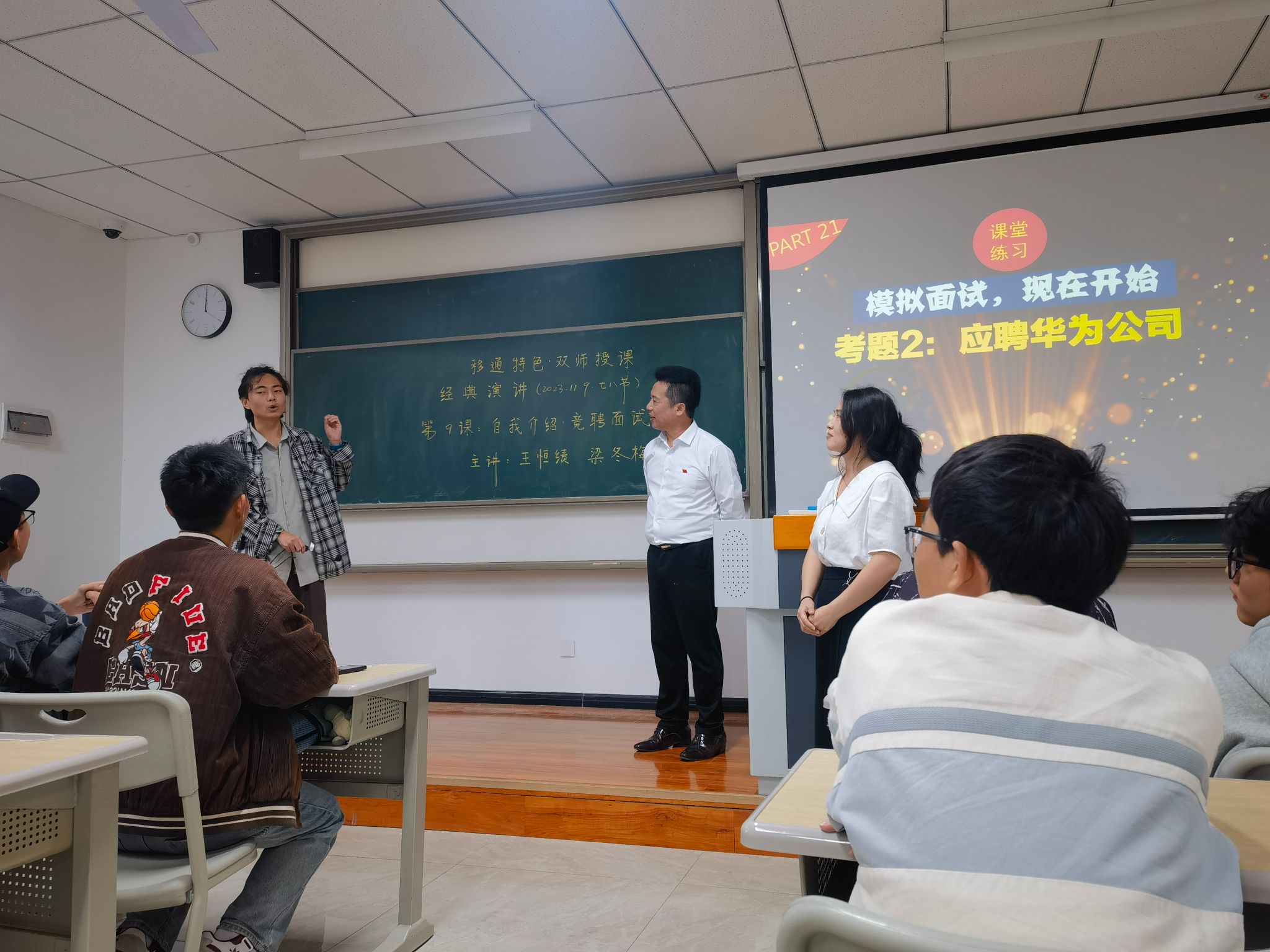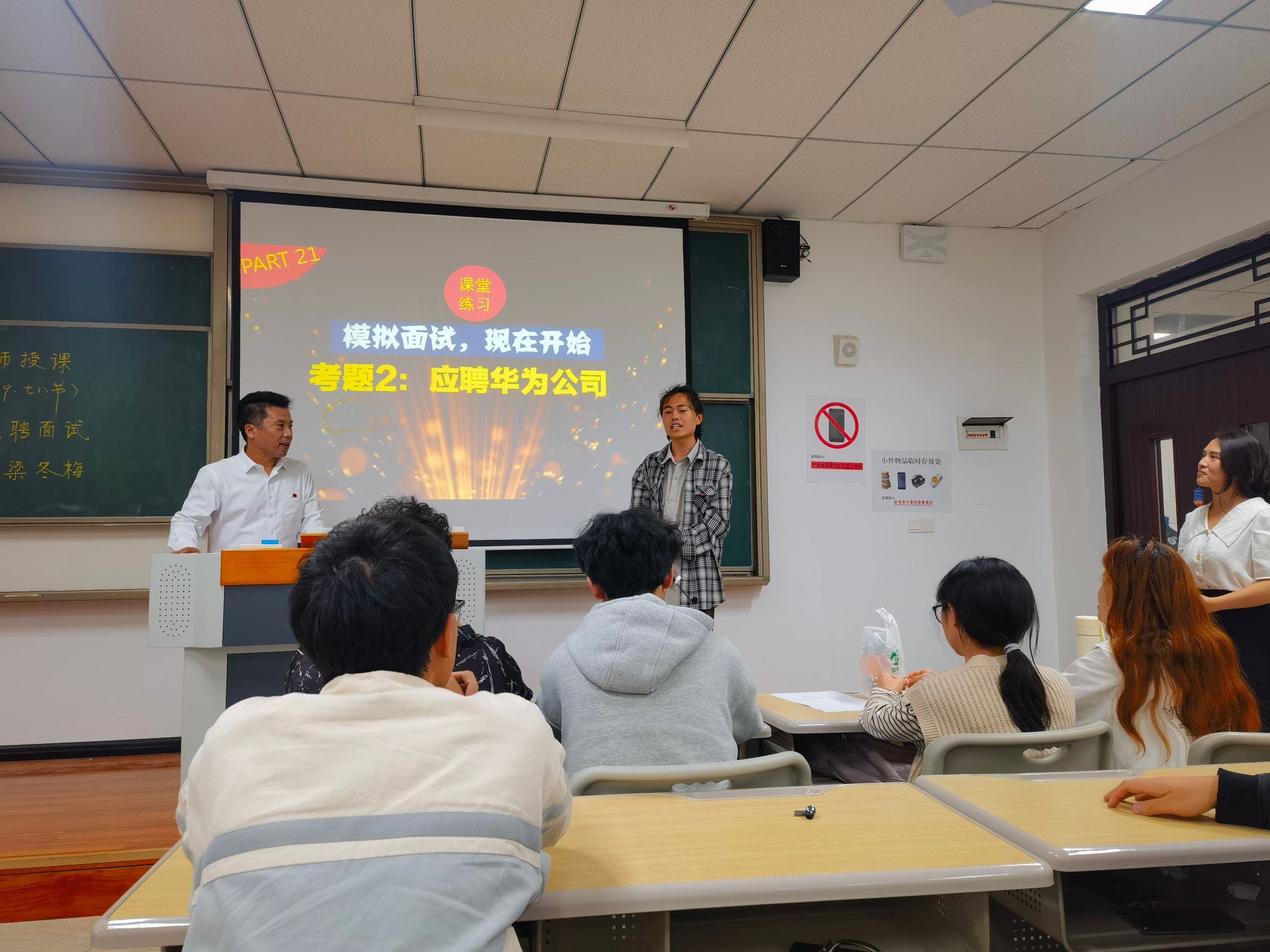 二位老师别具特色的出场方式,让所有同学都记住了这堂课。下面就进入了“模拟面试”环节,先后请了多位同学上台面试。面试有两题,第一题“应聘重庆移通学院校长”,台下好一阵笑声。第二题“应聘华为公司”,每一题都设置了四名学生面试官,王老师把问题都提前备好,发给了坐在第一排的四名学生面试官,问题相当刁钻,甚至带有攻击性。