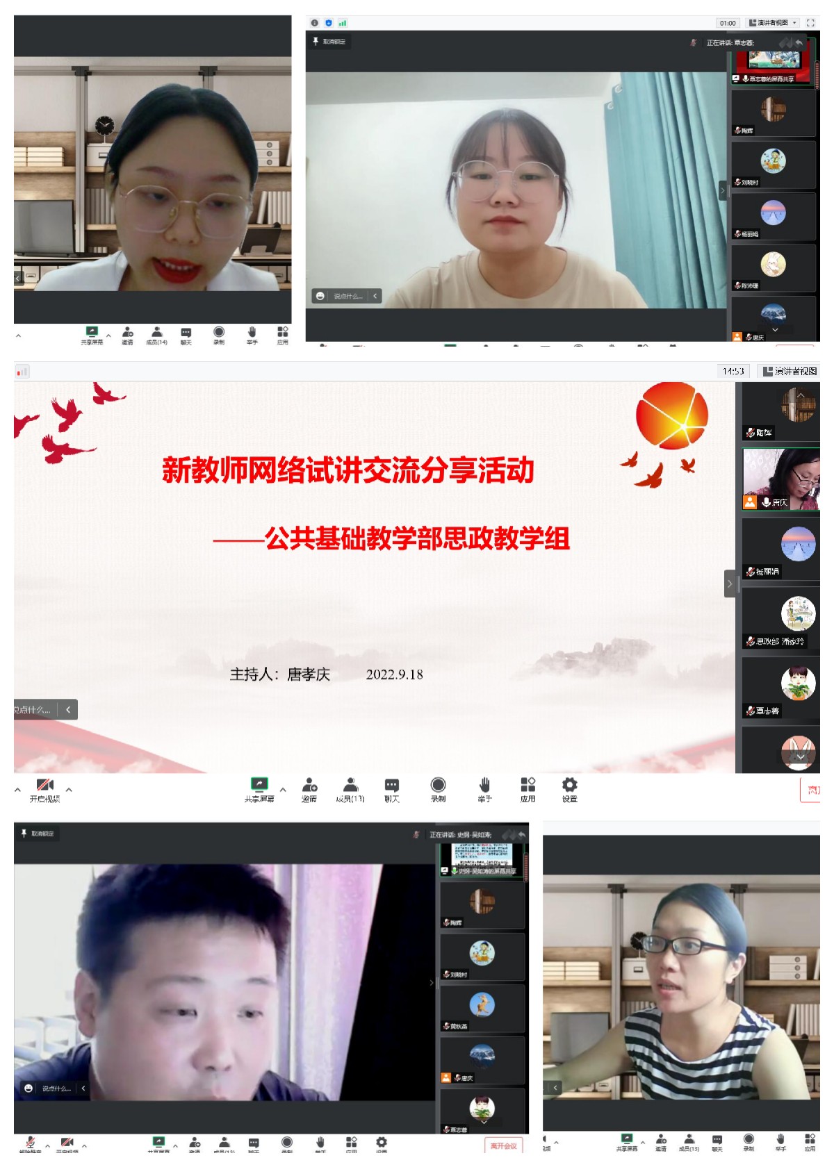 新教师是学校的新鲜血液,更是学校的主力军,肩负着“教书”与“育人”的双重使命。为帮助新教师尽快实现角色转变,提高教学技能水平,创新教学方式方法,更好更快的站稳讲台,公共基础教学部思政教学组于2022年9月18日上午,开展了新入职教师试讲活动。本次活动,学院领导高度重视、周密部署、方案详实,新入职教师认真对待、用心备课、全情投入。教学组负责人唐孝庆副教授、各课程负责人参加听课评分,并进行了线上全程指导。