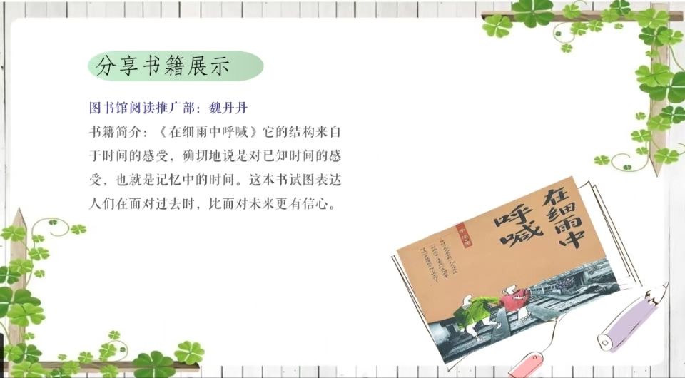 接着阅读推广部的魏丹丹同学分享的书籍《在细雨中呼喊》展现了对未来的憧憬。该书表达了人们在面对过去时,比面对未来更有信心。因为未来充满了冒险,充满了不可战胜的神秘,只有当这些结束以后,惊奇和恐惧也就转化成了幽默和甜蜜。这就是人们为什么如此热爱回忆的理由,如同流动的河水,在不同民族的不同语言里永久而宽广地荡漾着,支撑着我们的生活和阅读。而生活在拥有五千年文化的中国,我们因为懂得,所以慈悲。无论是穷困的,还是富有的,无论是老师,还是学生,我们都能在面对别人的时候心存悲悯。而从秘书处的窦兰同学分享的书籍《因为懂得,所以慈悲》中可以看出张爱玲对于女性的同情。在秘书处窦兰同学分享后,我的心得是我们可能达不到像张爱玲那样慈悲的深度,但是我们可以做到“在人之上视人为人,在人之下视己为人”。
