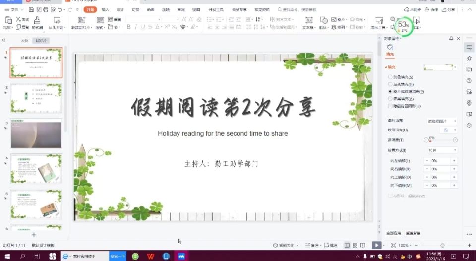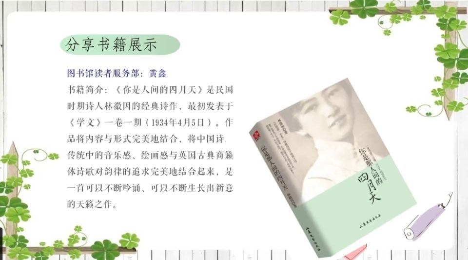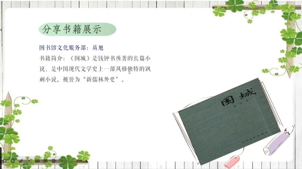为提升学生自主阅读的积极性,营造浓厚的阅读氛围,借以养成博览群书的好习惯,激发学生阅读的兴趣,假期里图书馆五个部门全体成员和图书馆五位老师在腾讯会议共同参与了第二期线上阅读分享会。