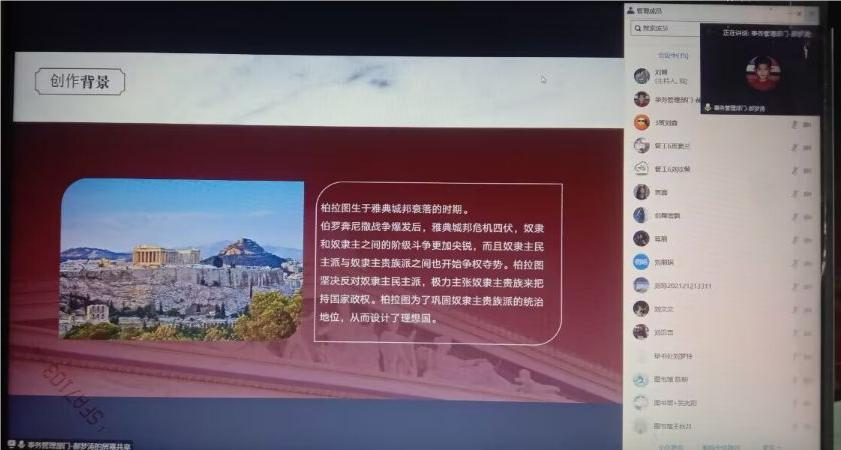每个人对于所生活的世界都有一个构想,这个世界或许是自由的,或许是幸福的,或许是没有疾病的,不同的人有着不同的想法,但他们往往忽略了最重要的道德因素。事务管理部的郝梦涛同学分享的《柏拉图的理想国》中,全方位的介绍了对于理想国的真正定义,给我们对于“世界”当时人们是如何去认识世界的一个清晰的了解。