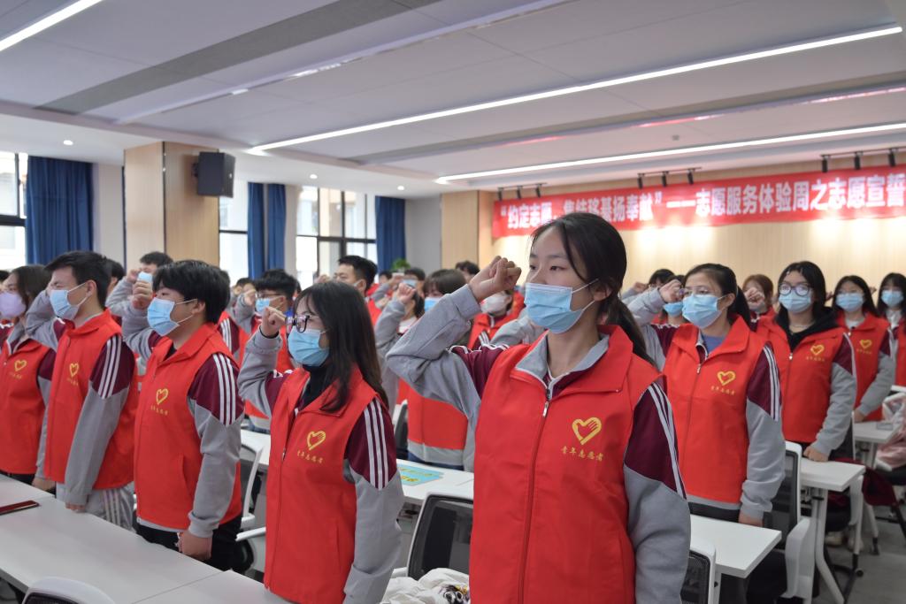 大会进行第四项,志愿者全体肃立进行了庄严的宣誓。新生志愿者代表王宇霞同学作为领誓人,带领同学们举起右拳,面向青年志愿者旗帜,共同立下激情澎湃的青年誓言:尽已所能,不计报酬,志于服务、携手同行。志愿者们声音铿锵、意志坚定,洪亮的声音在教室回荡,郑重的誓言在心间盘旋,他们将身体力行践行志愿精神,携手并进传承志愿大爱。