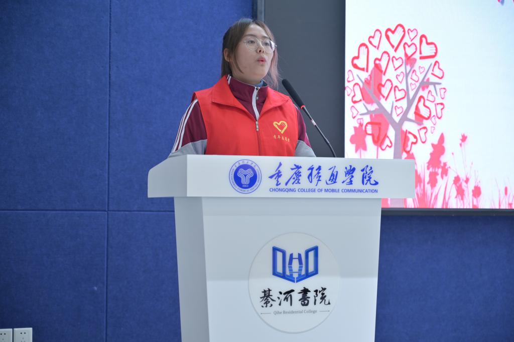 以心迎新,共遇綦境。新生志愿者代表王宇霞同学和大家分享了她与志愿服务的美好相遇。作为刚报到的新生,王宇霞同学是迎新志愿服务的受益人;作为青年志愿者,她是志愿服务精神的践行者,积极主动加入移通志愿者行列。她向全校青年志愿者发起号召:从自身做起,从身边点滴入手,尽自己所能,投身公益行动,用一个人的努力带动一群人,用一群人的行动创建和谐互助社会。