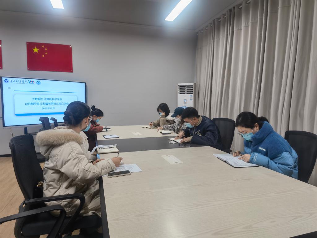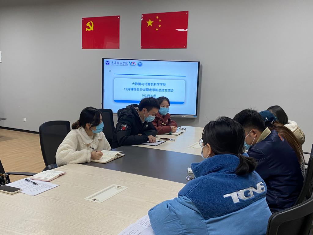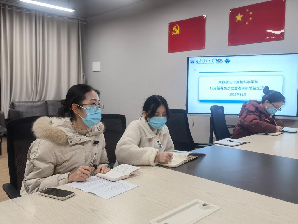 为了进一步加强学工队伍建设,提高辅导员的综合素质能力,促进新老辅导员之间的交流学习,推动学生管理工作和完满教育工作高效发展,12月16日上午,大数据与计算机科学学院全体辅导员在横山书院党团活动室开展了2022-2023学年12月辅导员沙龙暨“老带新”工作总结交流会。