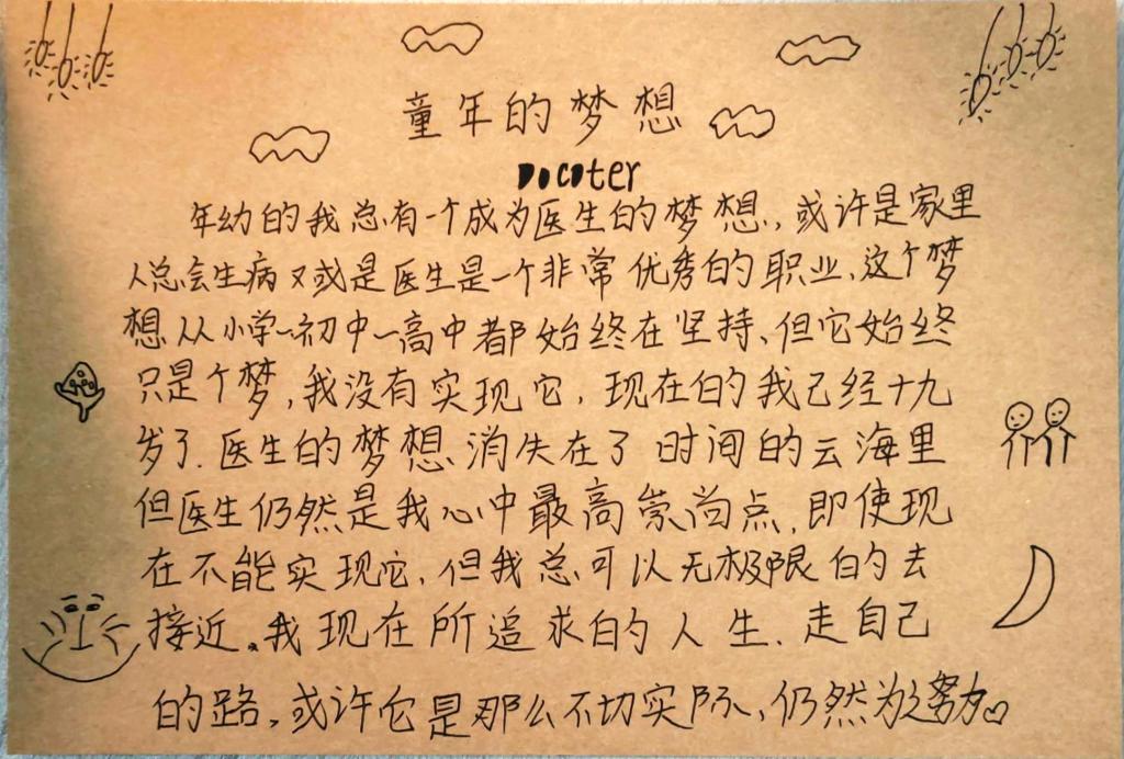 同时我也知道世界上尚且有许多难以治愈的疾病,我见过那些得了癌症的人,双眼无光,对生活已经放弃了希望,很令人心疼,我也很讨厌。因此我曾梦想过,在我成为一名科学家以后,我要研发出能够治愈所有疾病的药,让所有生病的人唤起生活的希望。但随着年龄的增长,我发现我离儿时的梦想渐行渐远了,我发现我其实没有那么深的钻研精神,那么擅长学习。