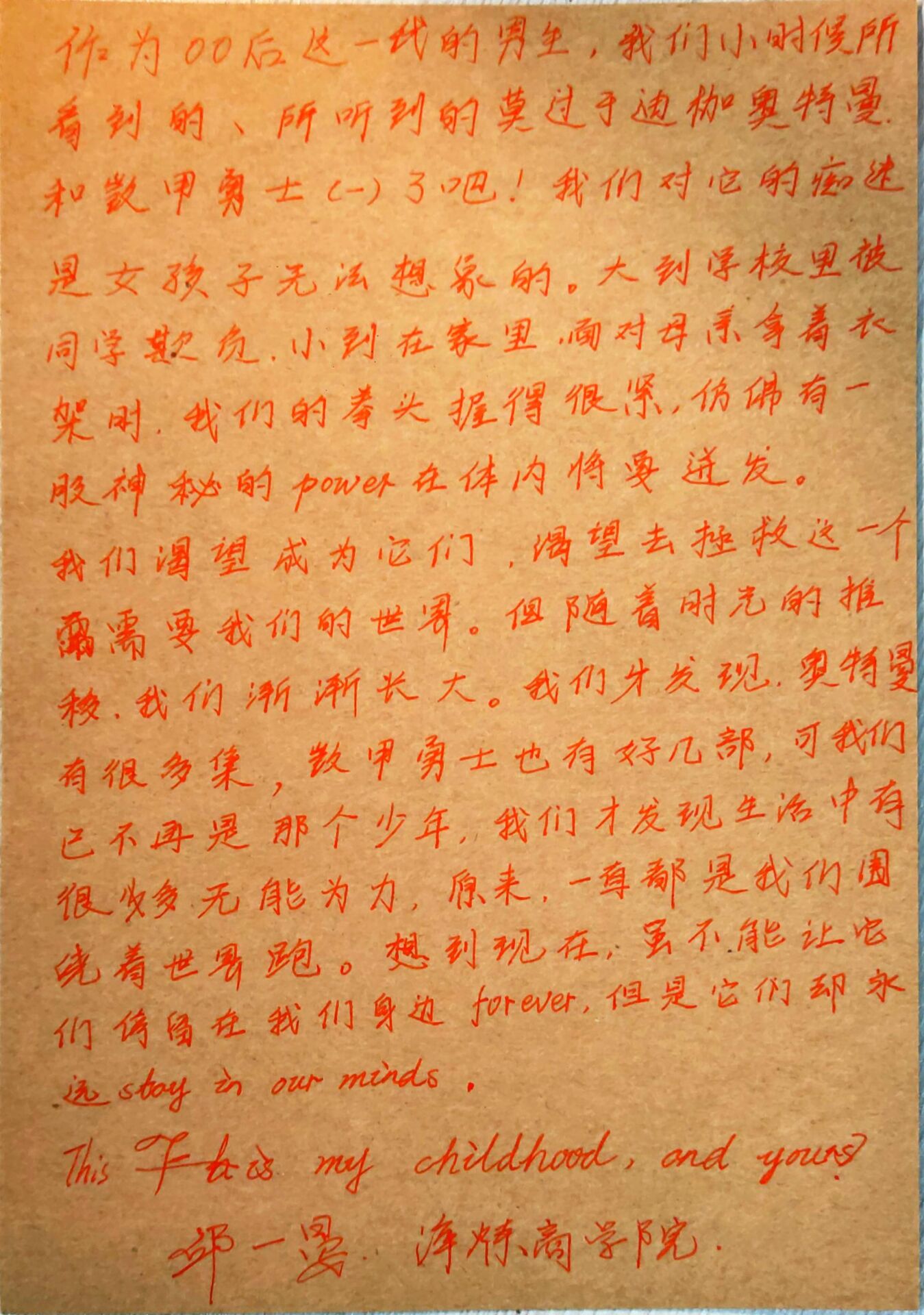 我们渴望成为他们,渴望去拯救这一个需要我们的世界,但随着时光的推移,我们渐渐长大,我们才发现奥特曼有很多集,铠甲勇士也有好几部,可我们已不再是那个少年,我们也发现生活中会有很多无能为力,原来一直都是我们围绕着世界跑,想到现在,虽然不能让他们停留在我们身边forever,但是他们却永远stay in our minds。