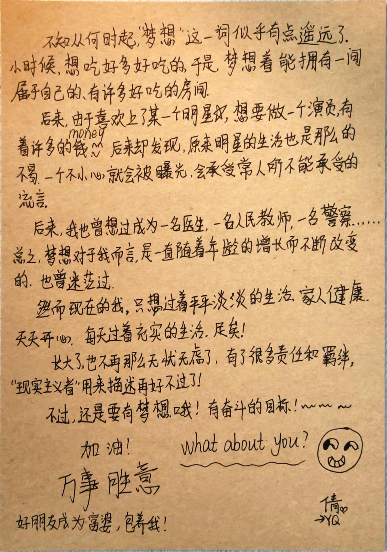 结语:綦河书院通过本次活动让同学们回忆童年,认识到梦想不是遥不可及的,不是一个随口提起的笑话。我们很多人不一定能实现自己的梦想,但它是我们最初的信仰,在想要放弃时回头看看,或许能从中得到前行的动力。我们如此用力的生活,是为了走在更好的路上,遇见更好的人,夜色难免黑凉,前行必有曙光。我相信每个人在信仰的鼓舞下都能让自己的青春更加瑰丽!