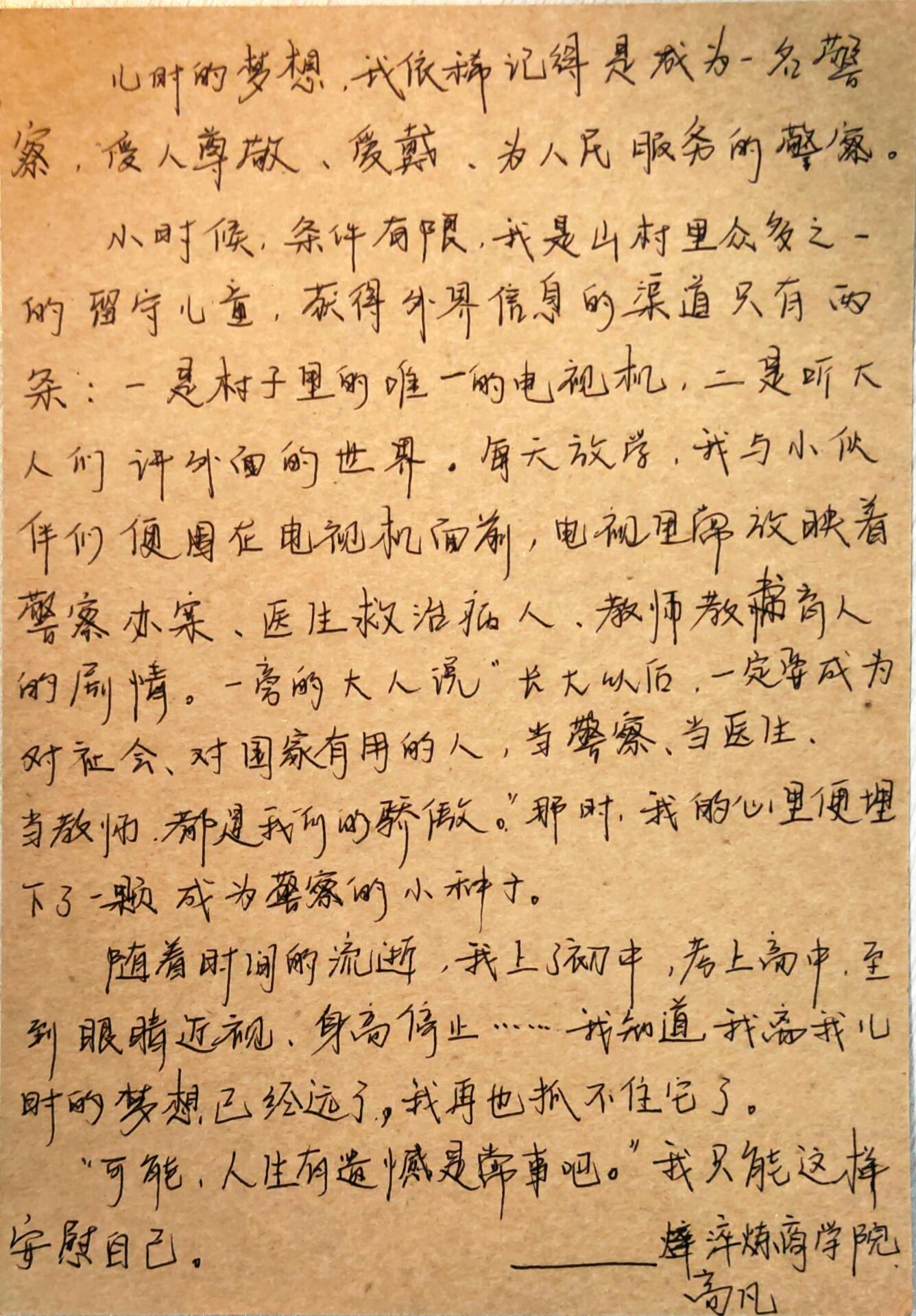 小时候条件有限,我是山村里众多的留守儿童之一,获得外界信息的渠道只有两条:一是村子里唯一的电视机,二是听大人们讲外面的世界。每天放学,我与小伙伴们便围在电视机面前,电视机里常放映着警察办案,医生救治病人,教师教书育人的剧情。一旁的大人说,长大以后,一定要成为对社会,对国家有用的人,比如当警察,当医生,当老师。那时我的心里便埋下了一颗成为警察的小种子。