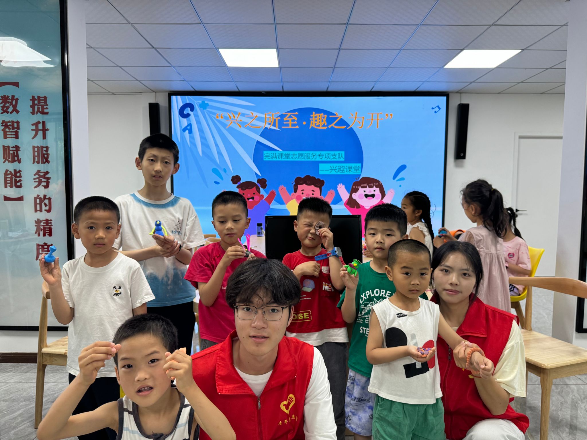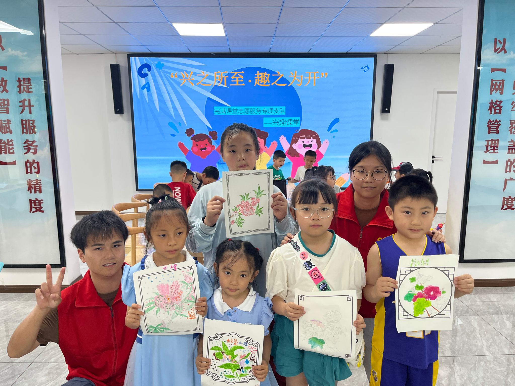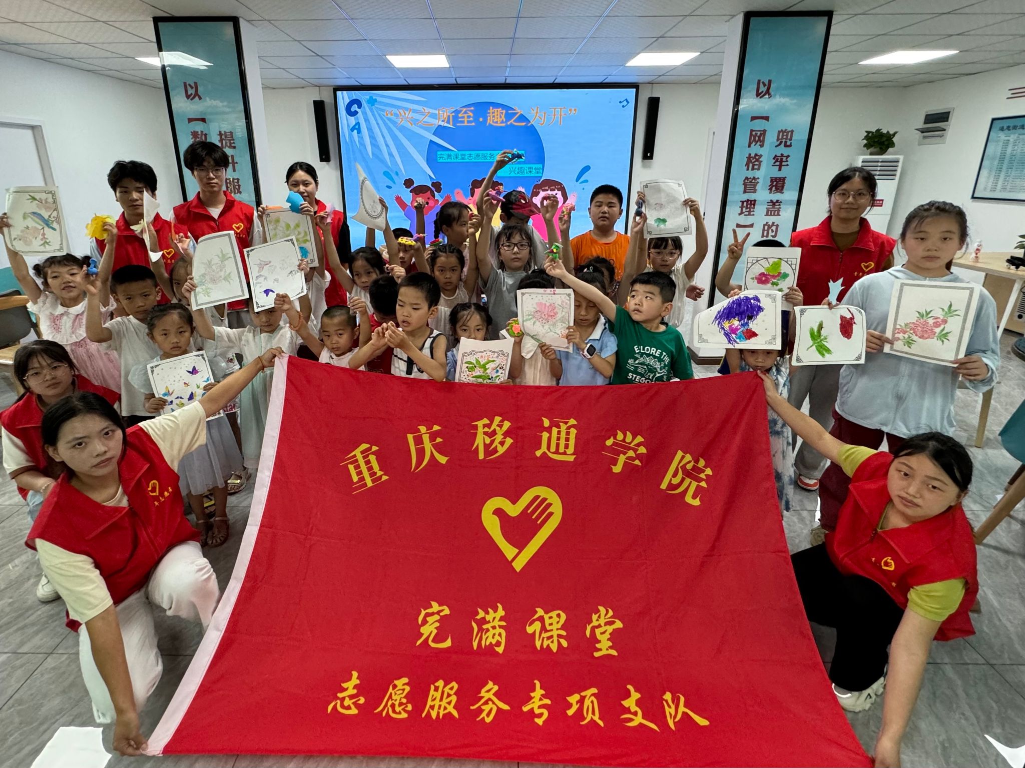 本次“兴之所至·趣之为开”志愿服务活动宣讲结束后,小朋友们纷纷站到台前,高高举起自己的作品,露出灿烂的笑容,与志愿者们进行最后的合影留念。相信这次活动能帮助孩子们发现自我的兴趣,培养积极的心态和社交能力,为他们的未来打好基础。“兴之所至·趣之为开”志愿服务活动就此落下帷幕,但其所传递的探索精神,已经在孩子们心中埋下了种子。