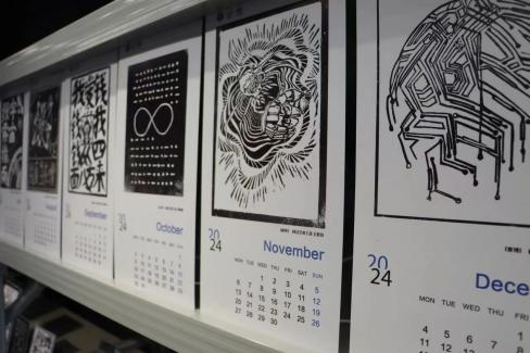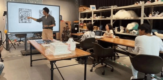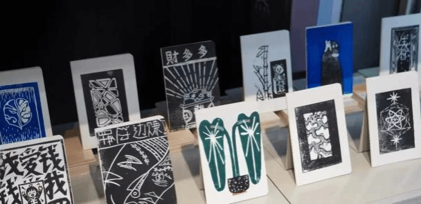 在旁边的空间,另有一个观众的网红打卡现场,观众在这里仿佛进入了同学们创作的版画世界。同时由李春阳老师拍摄制作的工坊视频也在这里播放,同学们可以通过视频更好的体会工坊的活动过程。