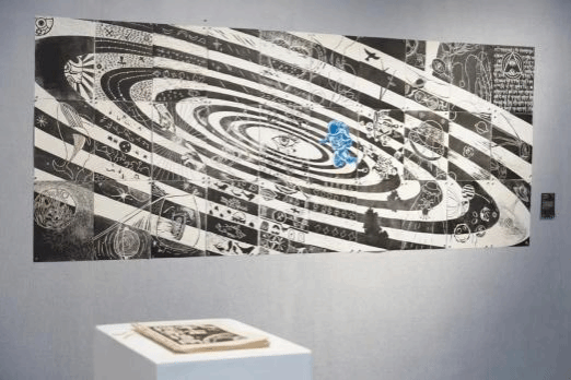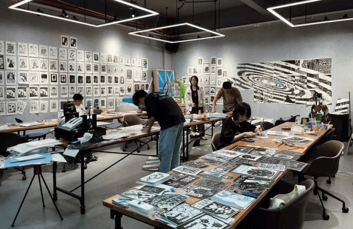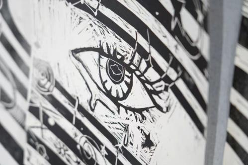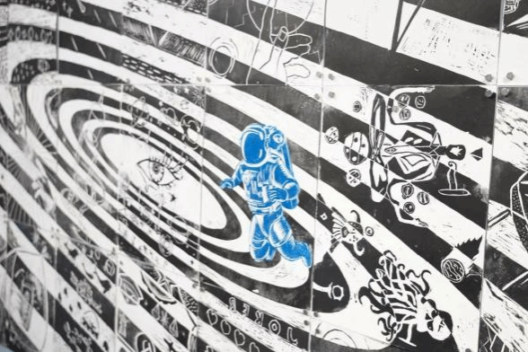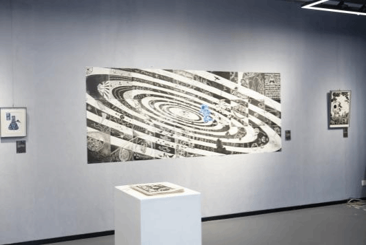 其中一幅巨型“星系”版画尤为引人注目,它如同一个宇宙的缩影,无数星球在黑白相间的背景上闪烁着,星系中央,一只眼睛注视着远处的宇航员,仿佛一个巨大的漩涡黑洞要将其吸入。其上还拼接了其他的许多元素,同学们纷纷惊叹于作者的想象力与创造力。这是一件名为《瀛洲系》的星河想象,尺寸1.2X3米。工坊指导老师给了每一个学员基础的图形,学员们则将自己对于科幻的想象都融合进画面。每一张作品都展现出别具一格的审美特点,组合起来又构建出一副完整宏大的宇宙幻想。