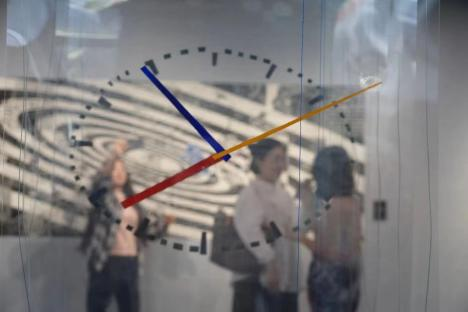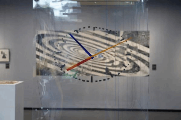 工坊指导老师袁理在展览的中心设计布置了一个与时间和维度有关的装置艺术作品。在三维的世界,我们体验不到时间的形状,但在特定二维,时间又被人们观测。作品巧妙的借用了套色版画的逻辑呈现出时间和纬度的思考。