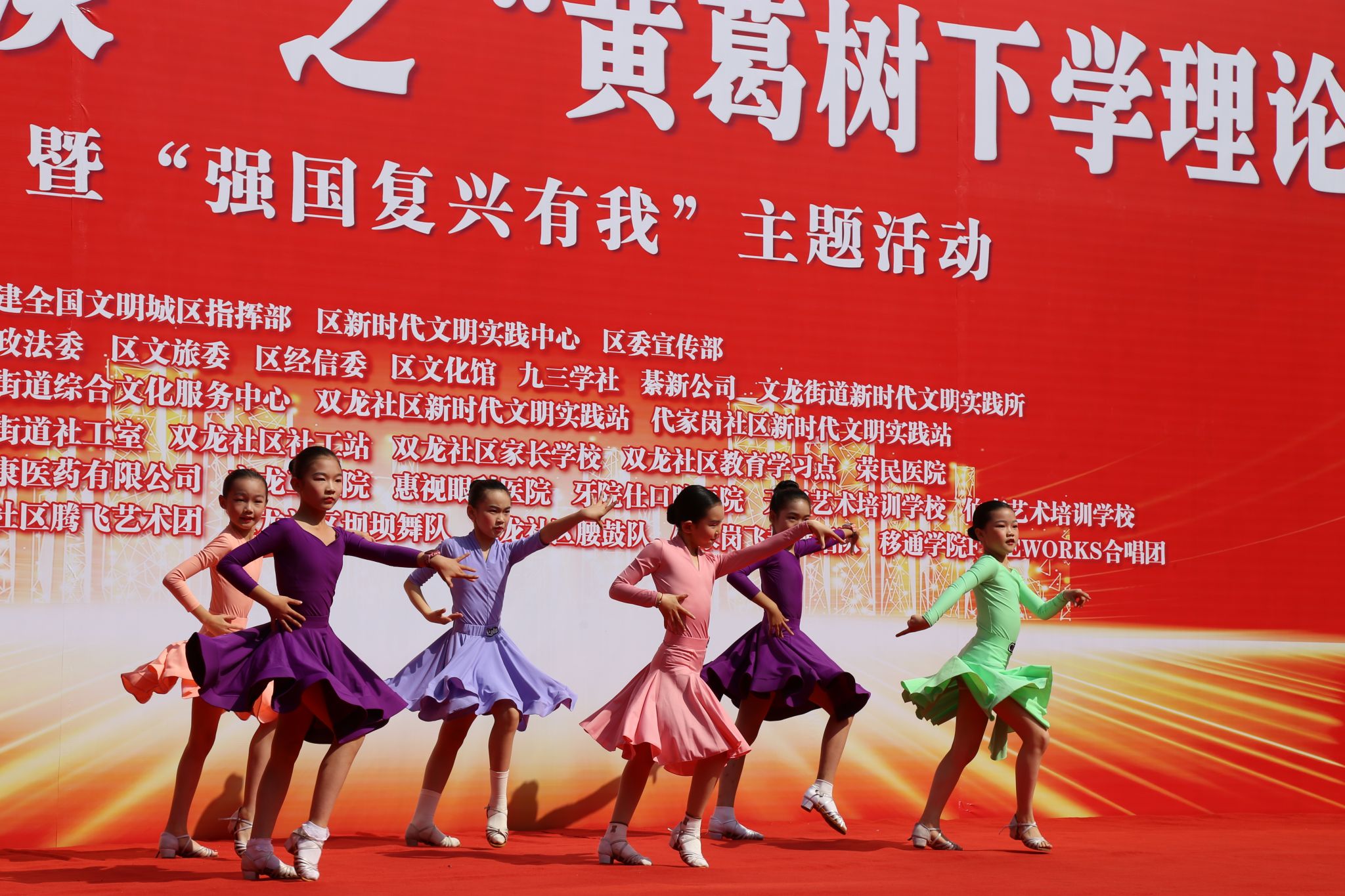 此次活动由綦江区委政法委、区文化旅游委、区经济信息委、文龙街道等多个部门联合举办,并得到了九三学社委员、文龙社区卫生服务中心等单位的领导和工作人员的大力支持,同时吸引了广大綦江区市民的积极参与。活动内容丰富多样,包括歌唱、评书、舞蹈、事迹讲述等多种形式,为观众带来了一场视听盛宴。