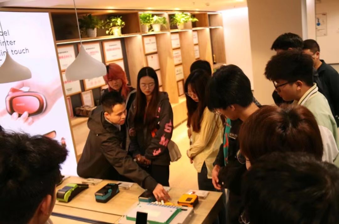 公司负责人首先让学生们初步了解公司发展历程,规模现状,主要客户,企业资质,硬件产品,工业标签等。再由工作人员带领学生们参观企业办公环境、产品展示体验区域、公司休闲场地等场所。