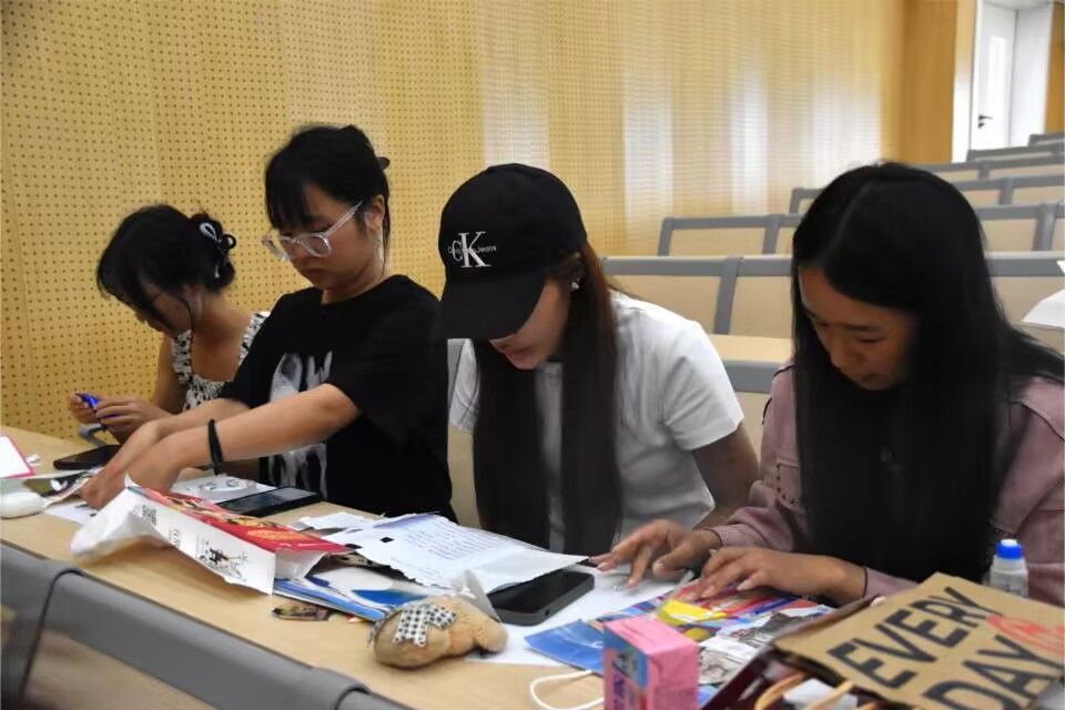 活动迈入第二阶段,瀛洲科幻学院的涂尧老师为在场同学深入浅出地解析了中国古代绘画作品的构图精髓与绘画技巧。她详细阐释了诸如“留白”“虚实相映”“点线面结合”等构图方法,以及“墨分五彩”“笔意相通”等绘画技巧,使同学们对古代绘画艺术有了更为深入的了解。涂尧老师借助空气这一无形之物,向同学们提问:“大家认为空气是何种色调?”她以空气为冷色调为例,巧妙引出了绘画中事务远近虚实的表现技巧,进而深化了同学们对冷暖色调在绘画中应用的认知。在实践环节,戏剧影视学院的邱爽老师带领同学们将所学理论知识付诸实践,利用环保纸袋、杂志和彩纸等材料,通过切、拼、贴、绘等技巧,将志愿服务中的感人场景转化为一幅幅生动的画作。这些作品不仅展示同学们的个人技巧,更体现集体合作的力量和志愿服务的深远影响。本次活动中还特别强调“志愿”在古代的含义。通过大家联想印象中最深刻的志愿故事,同学们深刻感受到志愿服务的精神内涵。大家纷纷表示,将积极参与到志愿服务中去,用实际行动传递爱心与温暖。