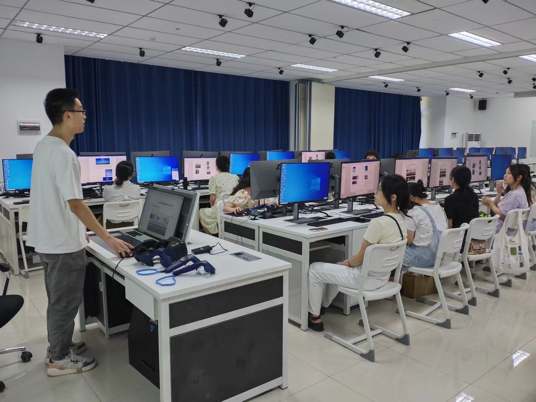 随后,刘俊伯老师对如何使用VR数字媒体图形训练中心实验室的VR设备进行了详细介绍,并将此设备的正确使用方法给大家做了细致的讲解,教大家如何调节VR眼镜,能让它呈现最佳效果。跟随着刘老师的讲解,很多感兴趣的老师也体验了VR设备。