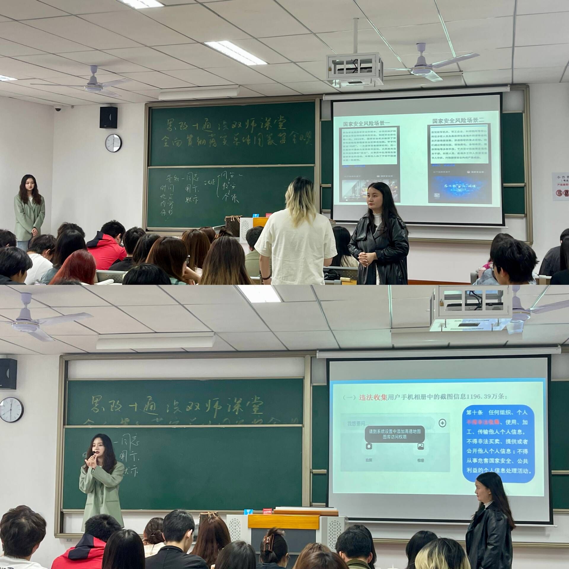 两位老师根据自身专业特长和课程优势分工合作。贺老师理论功底扎实、知识储备丰富,以大量精彩生动的案例讲授国家政治安全、国土安全、经济安全、社会安全、外部安全的内涵和意义。洪老师风趣幽默,注重理论和实际相结合,她以滴滴公司天价罚款案为例指出该公司存在的四大违法行为,重点阐述了信息时代网络安全、数据安全和人工智能安全对国家安全、个人安全的重要性。本次双师授课通过跨学科融合、精心教学环节设计,为学生打造了一堂理论与实践相结合、知识和能力共培育的别具特色的总体国家安全观教育课程,得到学生的热烈欢迎和一致好评。