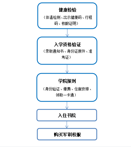 ①健康核验:在校门口进行红外体温检测、出示健康码或行程码、48小时内核酸检测证明,显示正常则可入校报到;