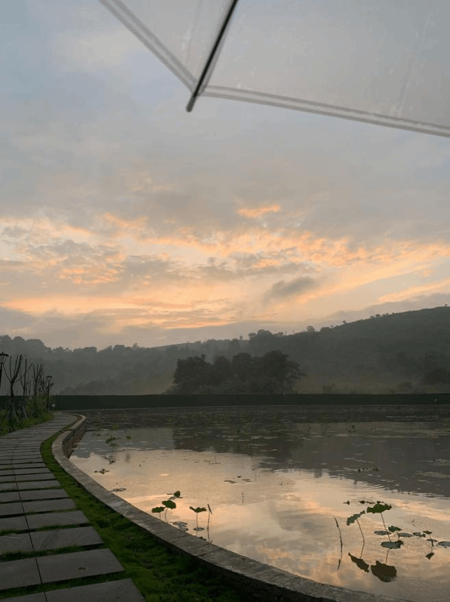 校园风光,镜花水月,映日河潭,彩云飘飘。这是雨停之初,万物从雨水击打的沉浸感中释然的美,镜湖上映照的是天边泛光的彩云,就着如此美景,在伞下撑着伞,度过了这场雨。