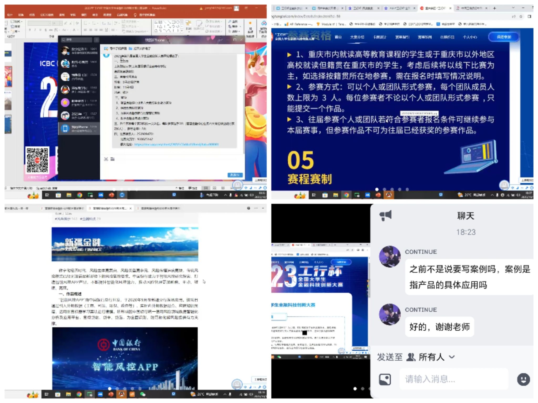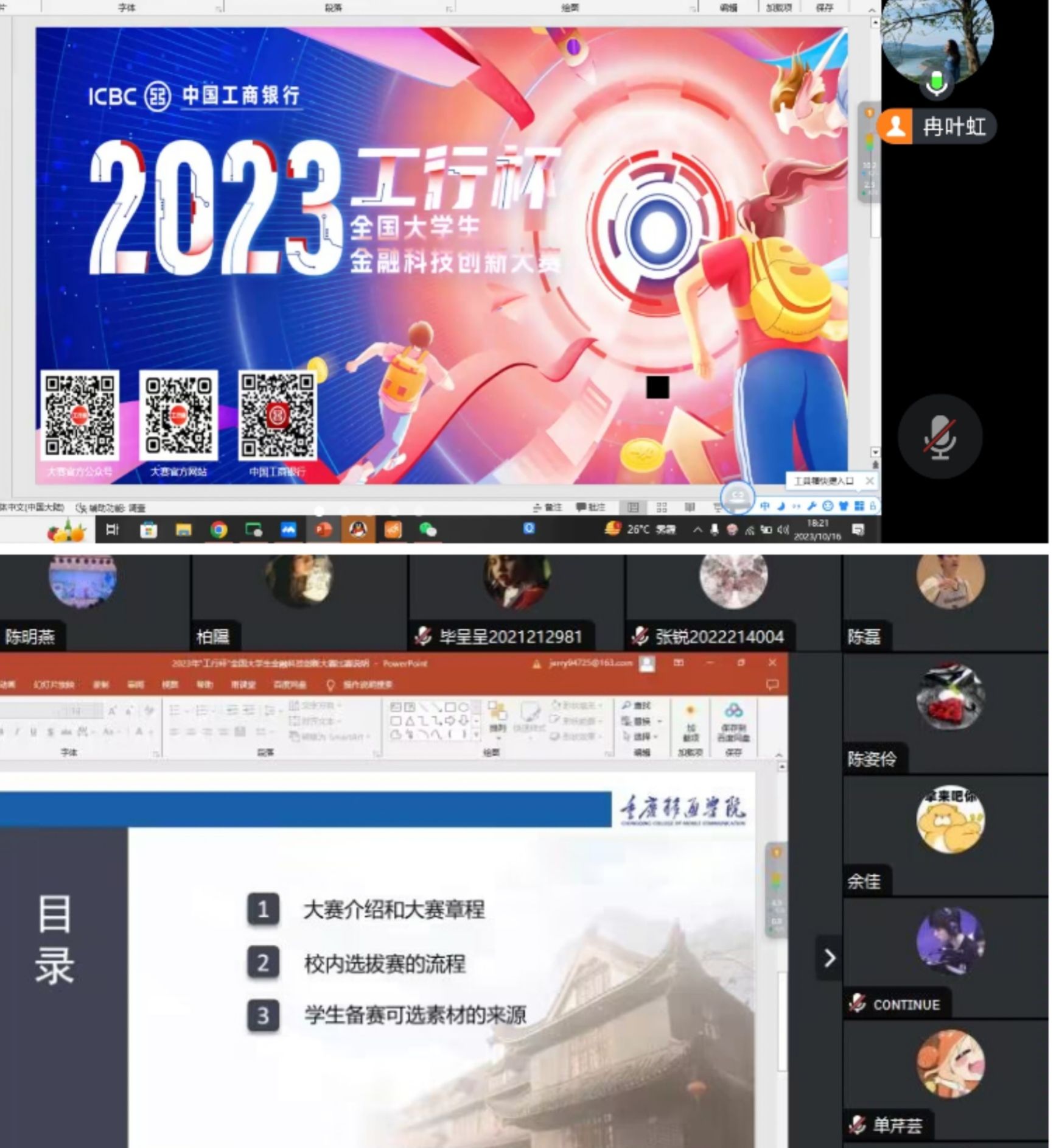 首先,冉叶虹老师为同学们详细介绍了“工行杯”全国大学生金融科技创新大赛的内容。大赛是围绕个人金融、场景金融、美好生活、无界创想四方面促进高校师生深入了解金融科技发展前沿,共同打造数字时代的金融标杆产品。冉老师还以“正大杯”全国大学生市场调查与分析大赛为例,清晰明了的为同学们指出“工行杯”校内选拔赛的各项流程,让同学们做好赛前准备工作。