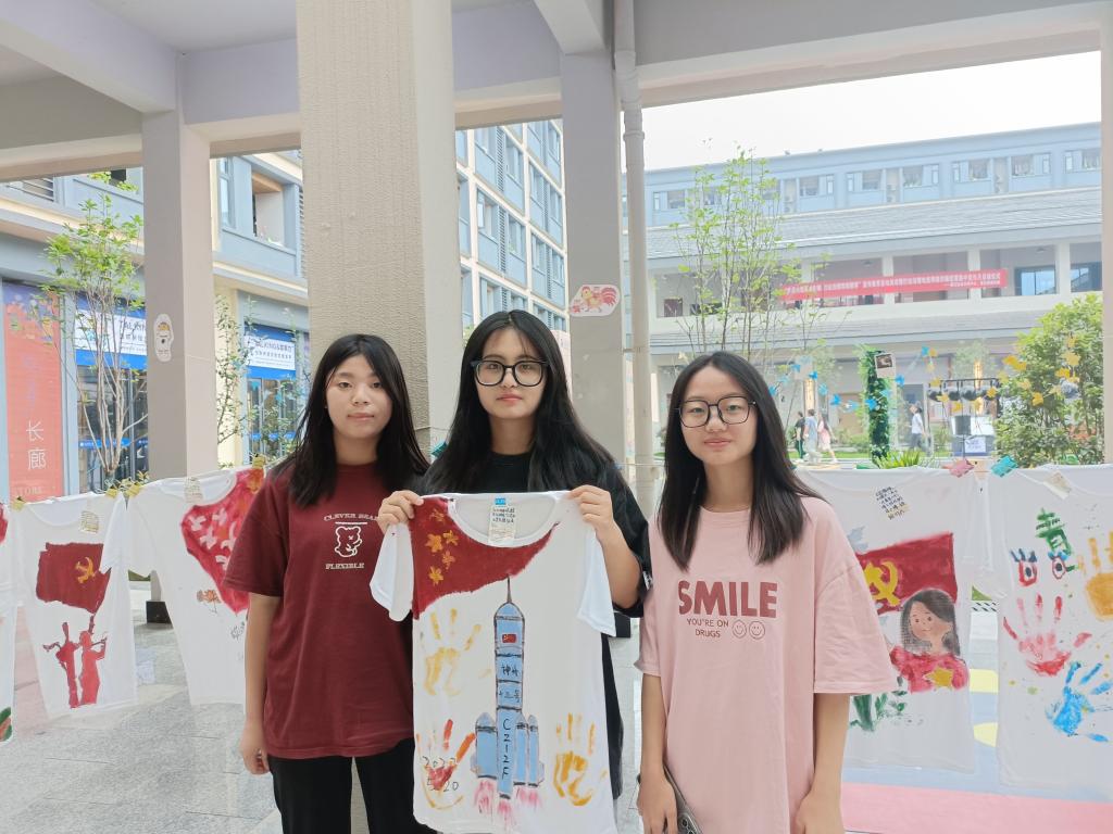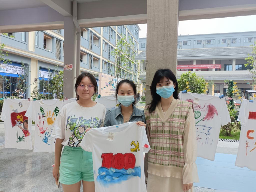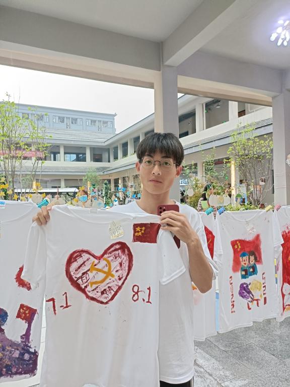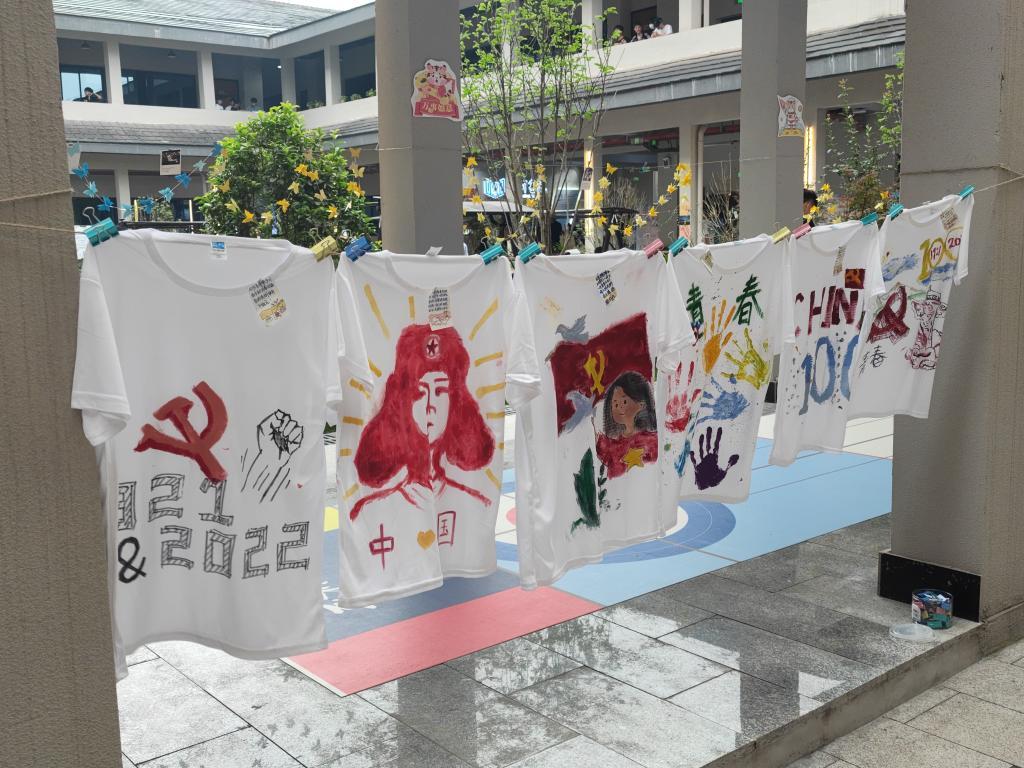 绘画活动结束后,优秀作品展示拉开序幕。在綦河书院二号楼中庭,一件件美丽的文化衫随风飘扬,似乎展示着同学们的青春,述说着同学们对党的忠诚。参观的同学络绎不绝,极大地增强了同学们的自信,也反映出本次活动的意义。