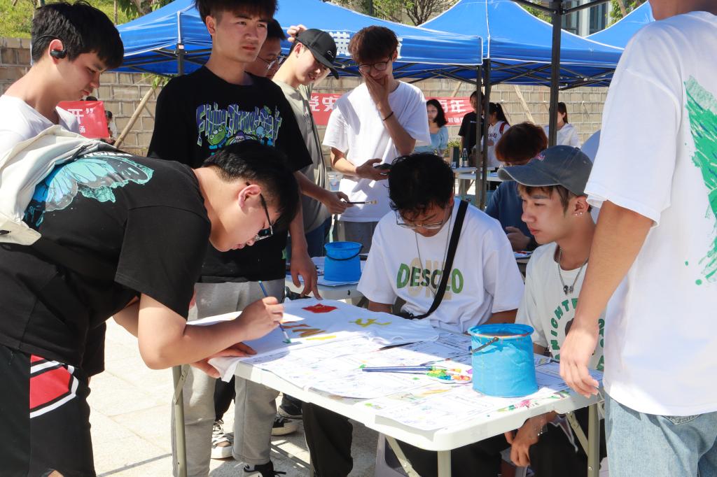 活动伊始,同学们热情高涨地涌了过来,工作人员进行简单的开场白介绍后,同学们确立自己的主题,陆续到物资领取处领取T恤、画笔、便利贴、颜料和水桶,分别到相应的位置进行创作。