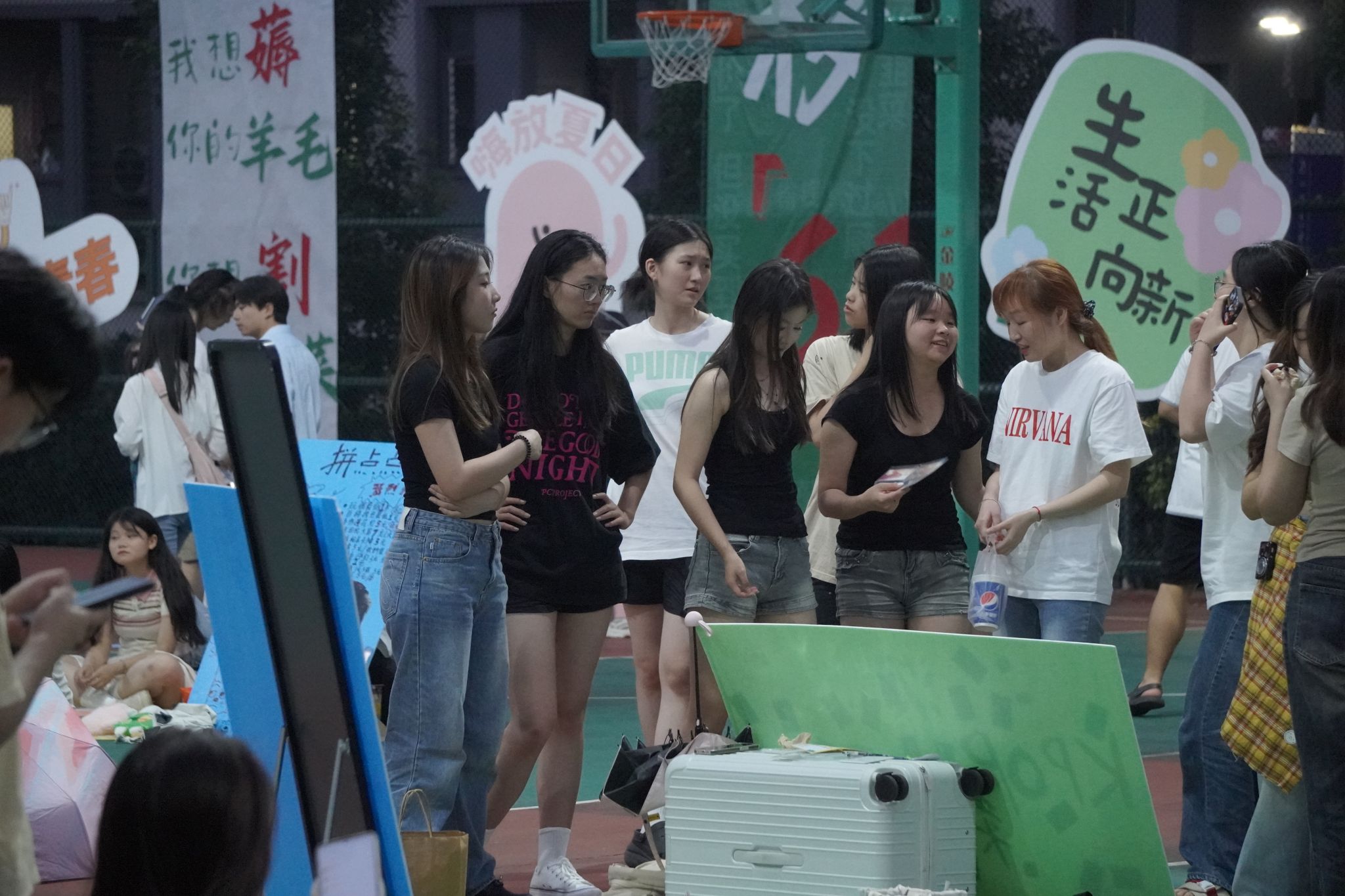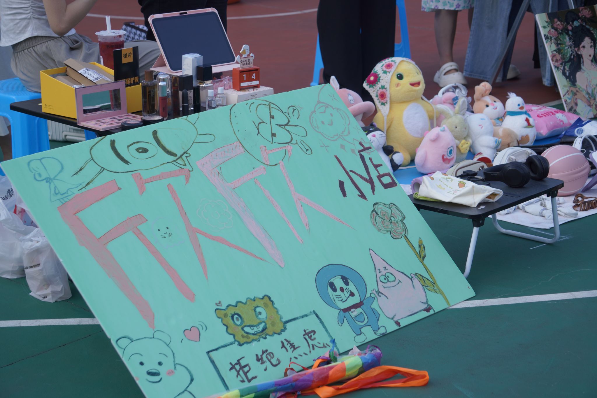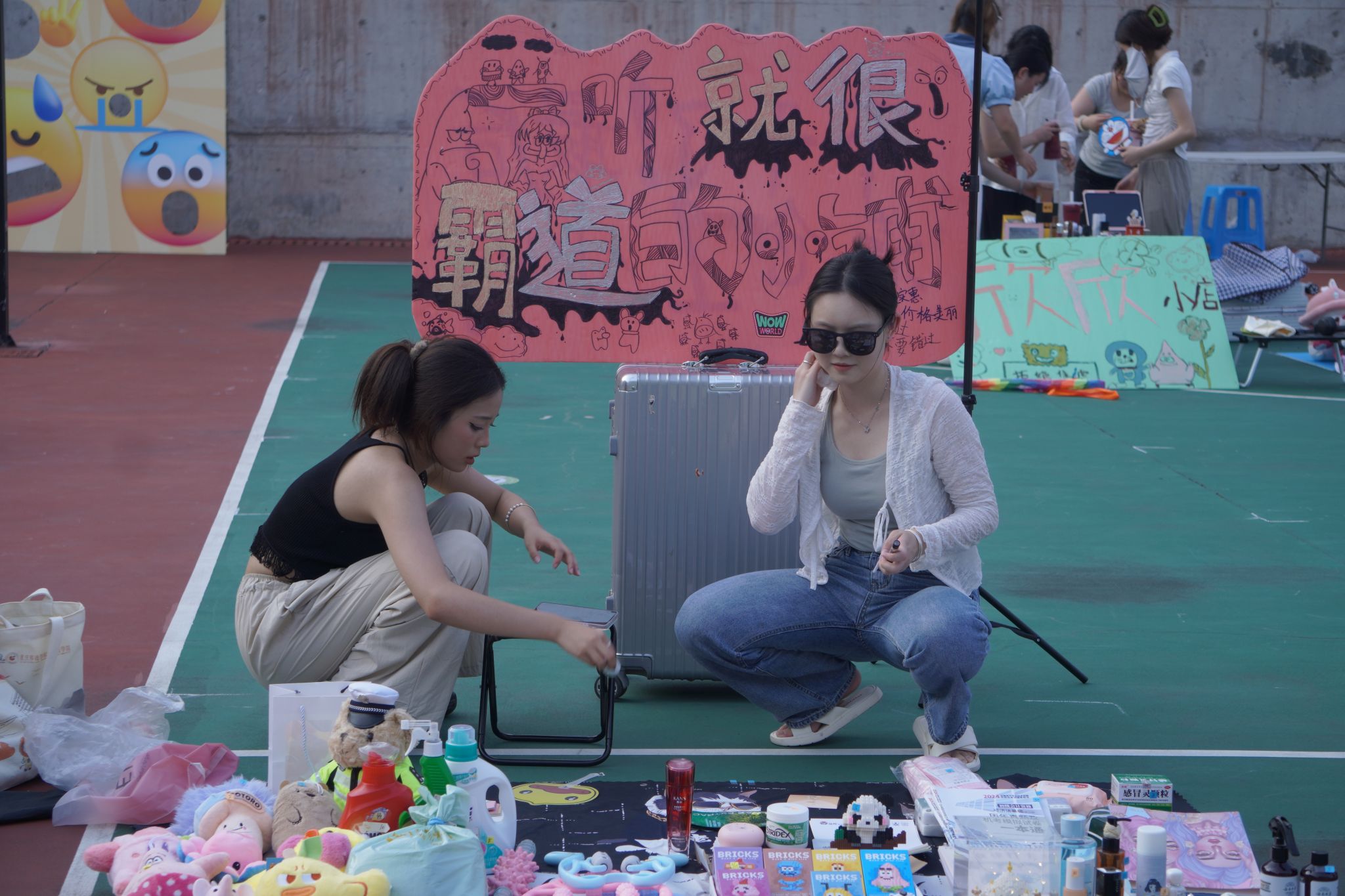 活动前期,通过QQ群等多种方式进行广泛宣传,各摊主自发组队报名,并在活动群了解详细信息。通过工作人员的严格筛选,共100个摊位通过审核。在线下会议的展开下,摊主们明确知道自己所在的摊位号,领取海报并自行设计。6月14号15:00,现场工作人员提前在瀛溪篮球场划分区域,布置活动现场。夜幕降临,摊主们陆续根据点位图聚集,按照指定位置进行摆摊,在去年的基础上还多了创意手工 DIY 摊位。前来淘宝的老师和同学们都淘在其中,乐在其中。