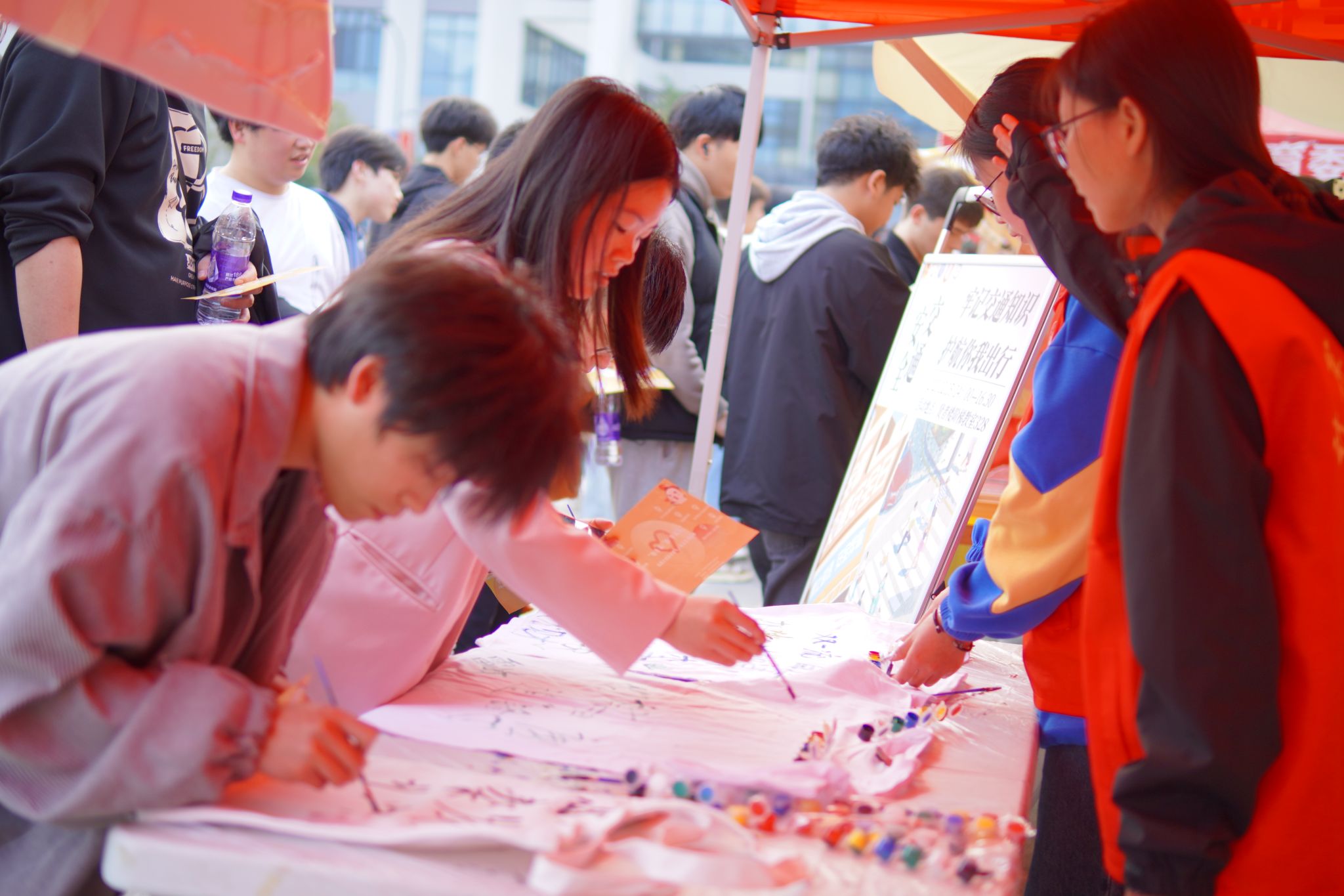 阳光洒在图书馆前广场,来自各学院的青年志愿者们汇聚一堂。“一院一摊位”的原则限制不住他们饱满的热情和无限的创意。有趣的绘画接龙、拒绝精神内耗的心灵交谈,欢乐的互动问答互动体验——不限形式,趣味性和吸引力共同拉满,构筑了一个青春充满朝气的文化集市。