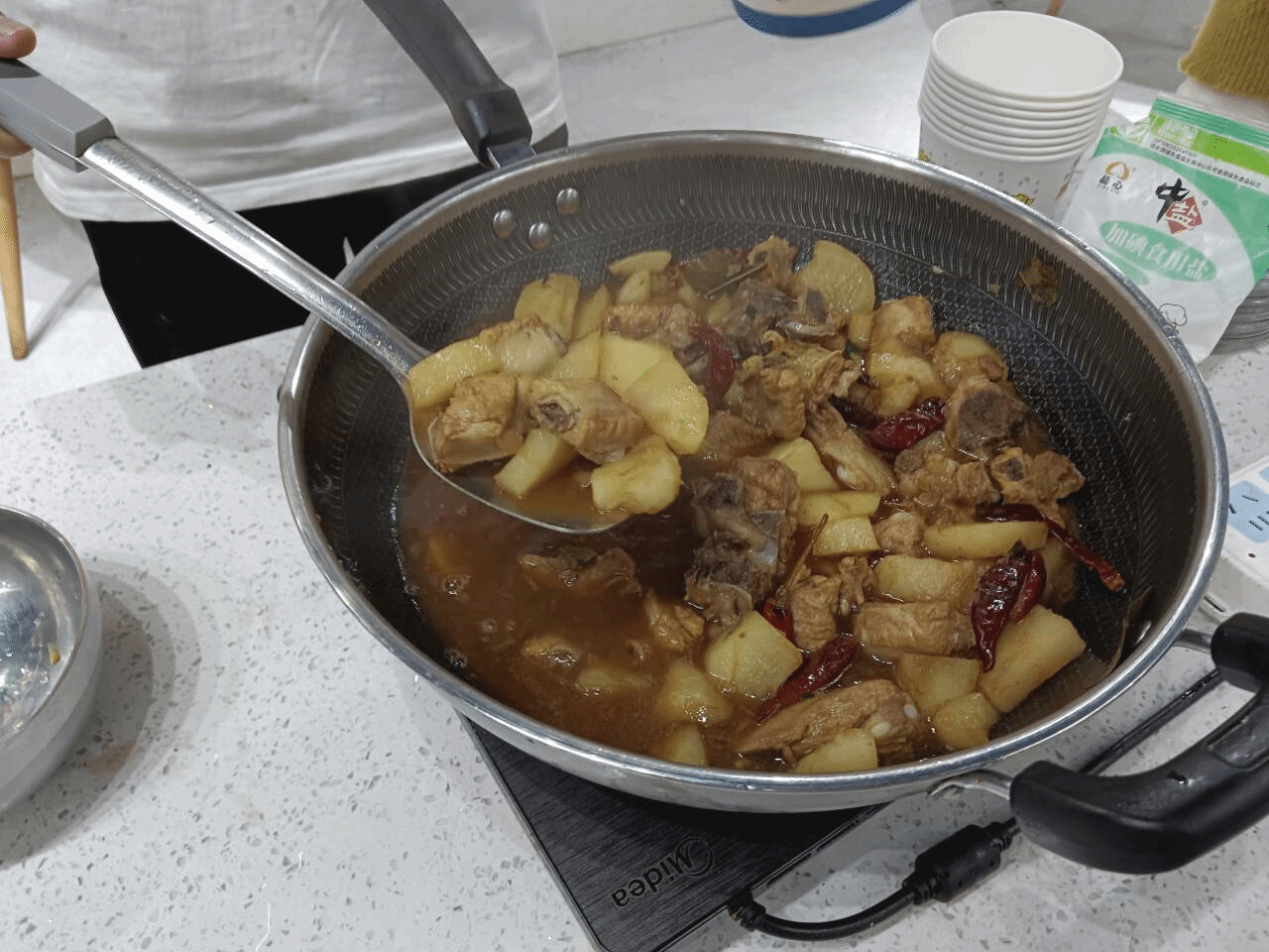 在活动期间,参与者们在工作人员的带领下,将猪排骨洗净,切成小段备用;生姜切成片,葱切段备用。然后起锅烧油,爆炒葱姜,再煸炒排骨至微黄。然后加入适量的料酒,炒去腥味。倒入生抽和老抽,翻炒均匀让排骨裹上酱汁色泽。随后倒入足够的清水,淹没排骨,并加入适量冰糖和少许盐,盖上锅盖,转小火焖煮40-50分钟,直至排骨变得酥软入味。待汤汁浓稠时,收汁至适合口感,即可关火。这样一道美味的红烧排骨就做好啦!