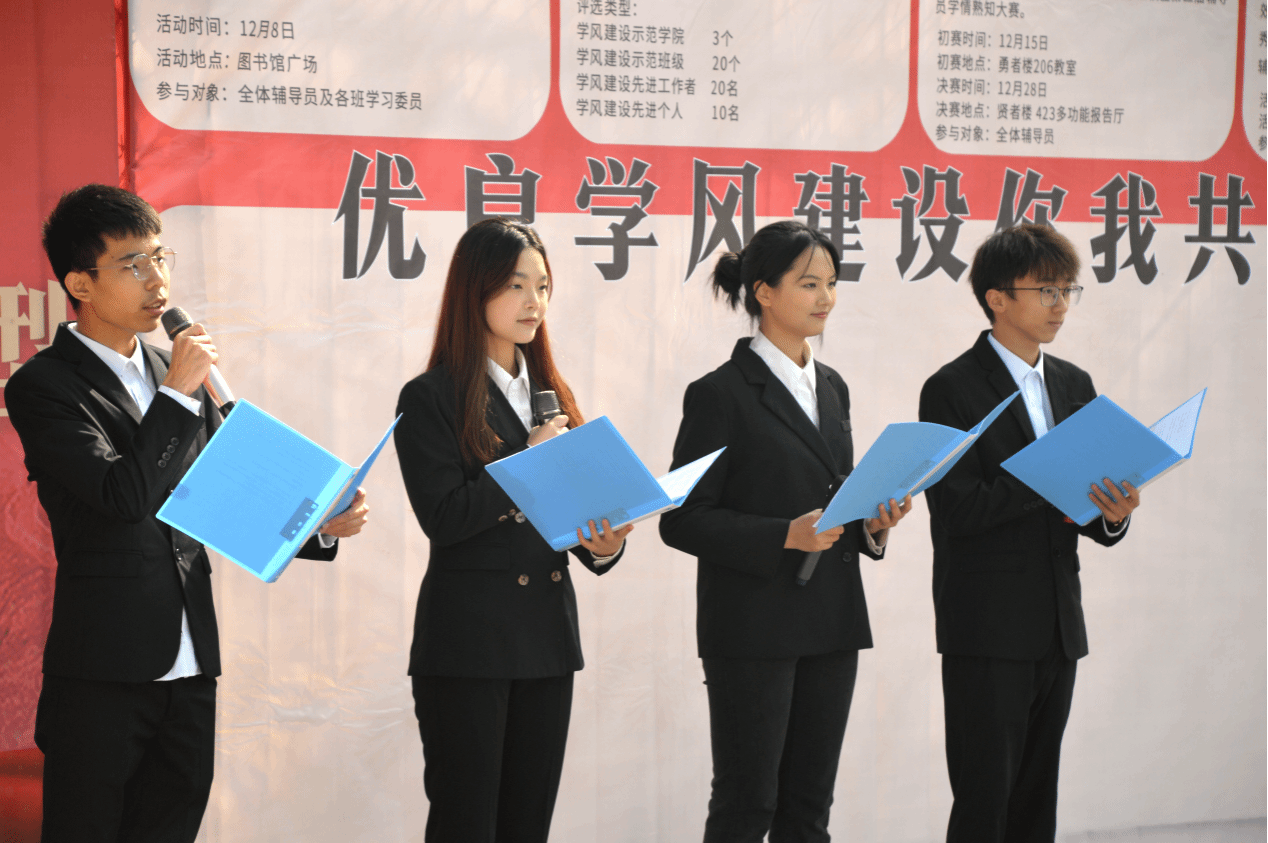 以德为行,以学为上。学风是衡量一所学校对于师生精神文明塑造的标准之一,为充分发挥学风先进集体及个人的示范引领作用,激发广大移通学子学习动力和专业志趣,调动学生自主学习积极性,教育引导学生珍惜韶华、丰富学识,建设浓郁优良的学风氛围,推动提高我校人才培养质量,学校特组织开展“比学赶超优学风·榜样示范树典型”学风建设示范月系列活动。12月7日,启动仪式在图书馆广场隆重举行,学生处、各二级学院及全体学习委员共同见证本次学风建设示范月拉开帷幕。
