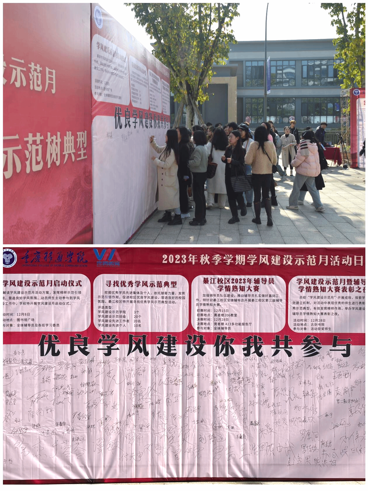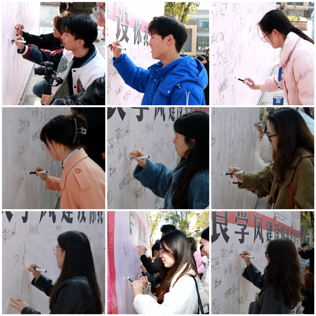 学校优良学风建设,每一名同学都是排头兵、领头员。校区长久以来保持着良好精神风貌和全员诚信考试记录,这份荣誉的背后是移通学子的努力。在勤工岗位学风督查员的带领下在场师生纷纷在主题喷绘上签下自己的姓名,为推动学校优良学风建设迈上新台阶作出自己的承诺,共同营造校园良好风气。
