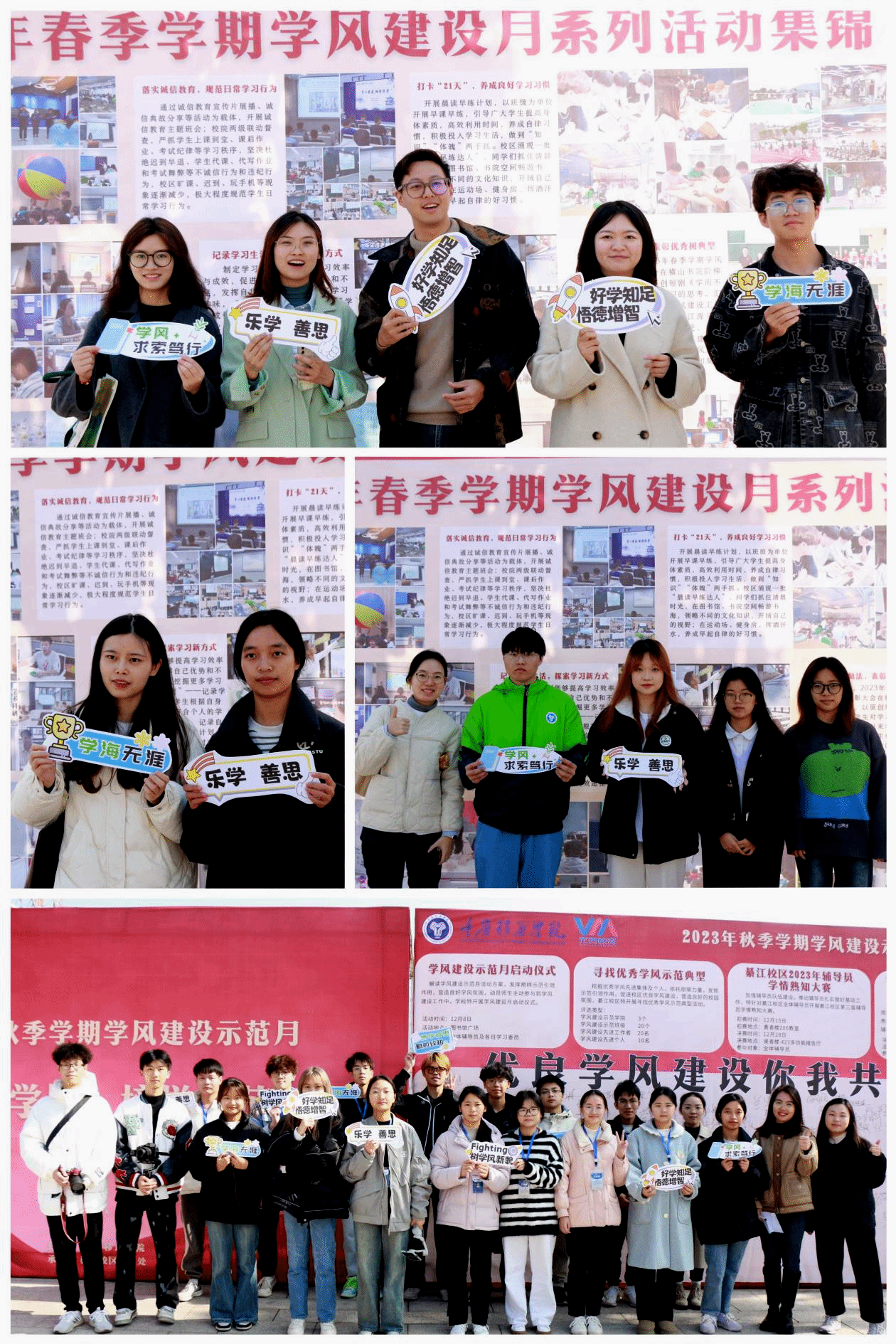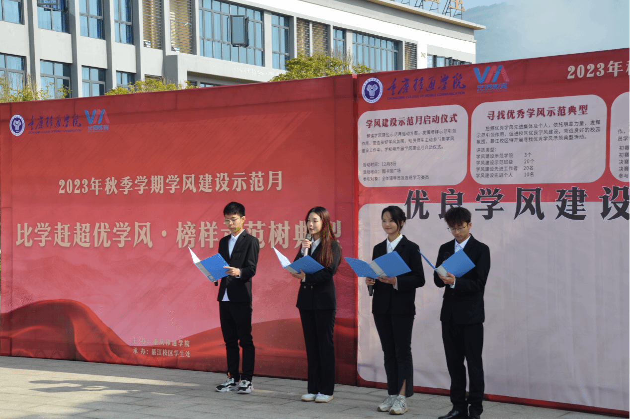 学风是学生思想道德品质、学习精神与综合素质的重要体现,多维度、全方位推进学风建设主题活动,是落实学风建设立德树人的关键举措。本次启动仪式是学风建设示范月系列活动的开端,呼吁校区更多师生关注与参与学风建设,帮助同学们切身体会学风建设的重要性及优秀学风校园带来的无限可能。綦江校区将会持续开展更多学风建设示范月特色子活动,打造更多优秀典型,营造浓厚学习氛围,助力文明校园建设。
