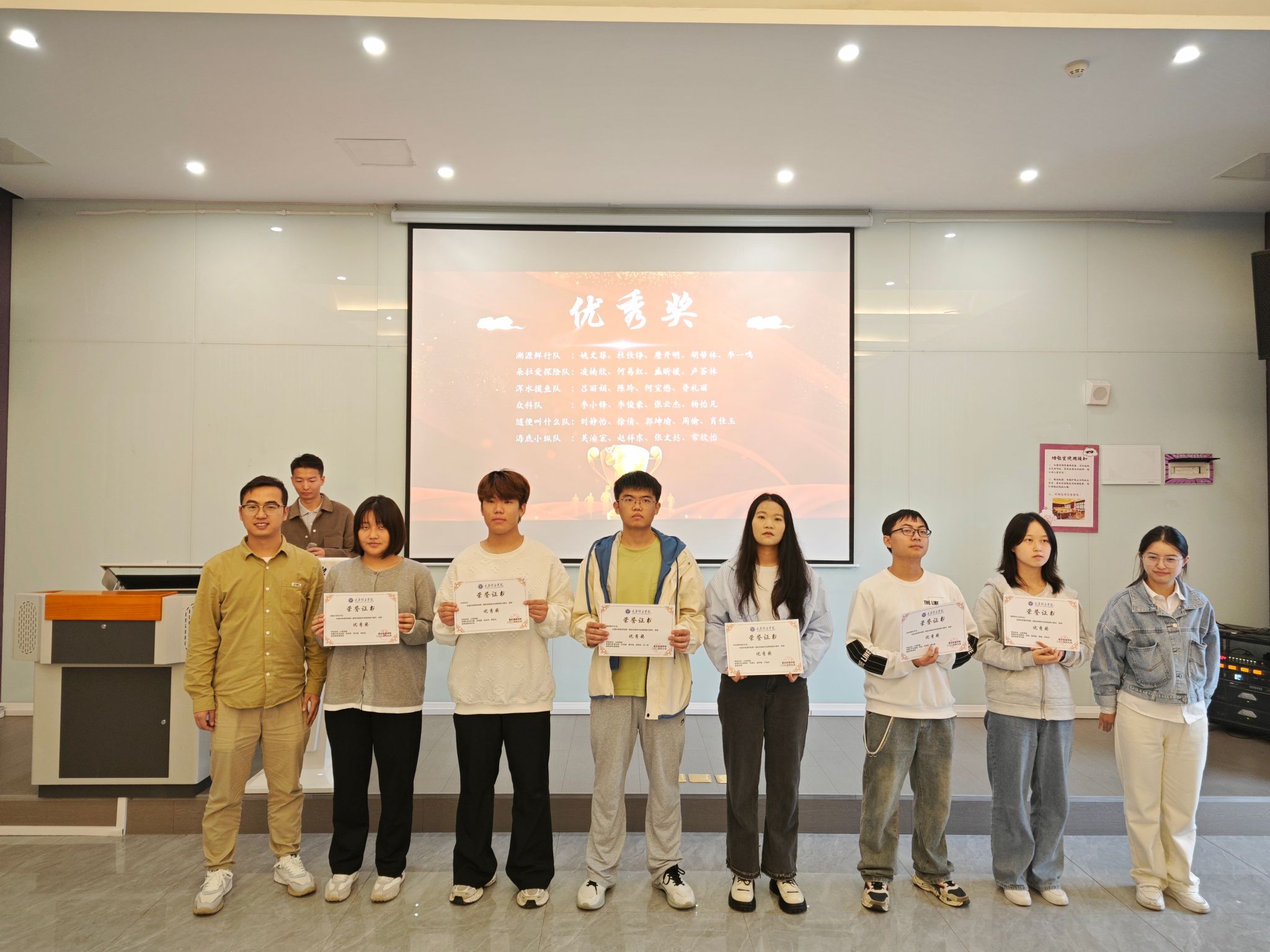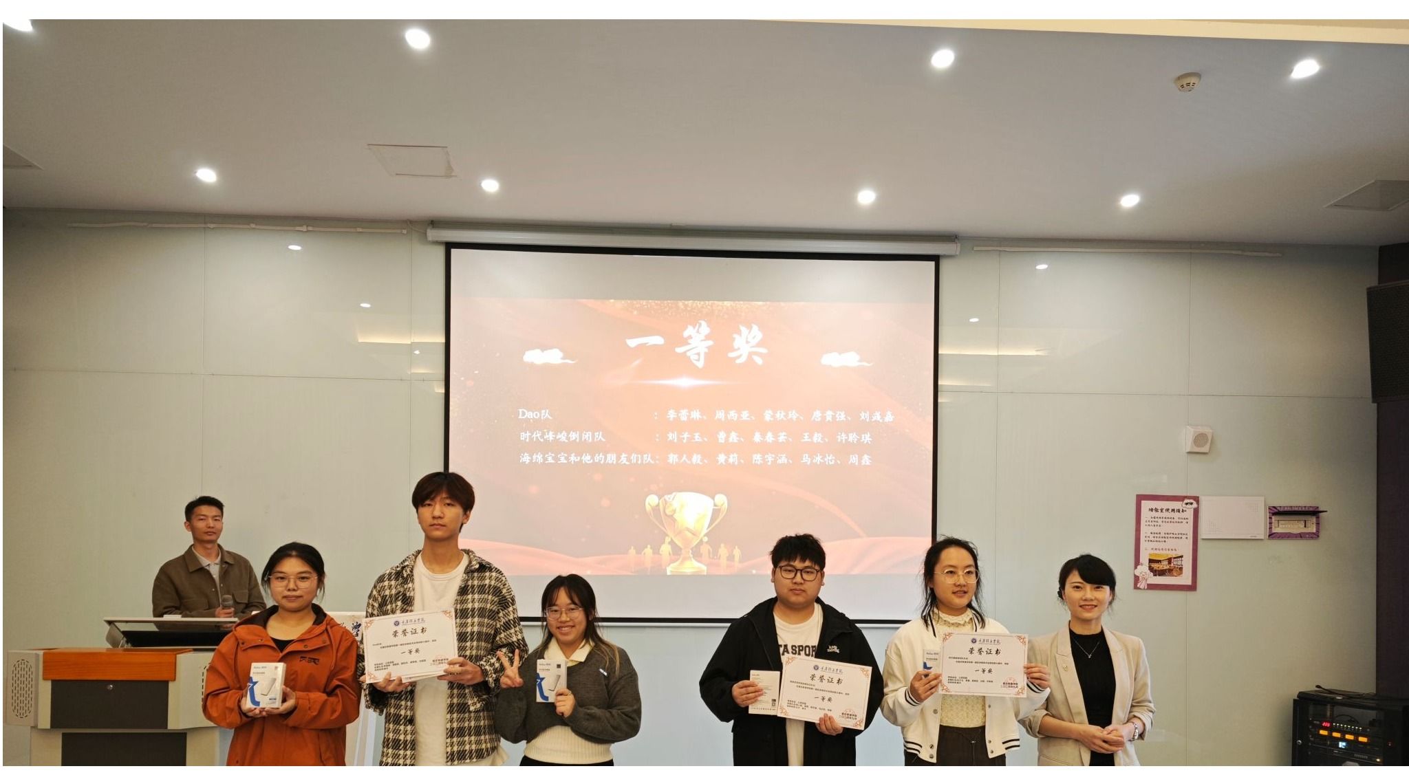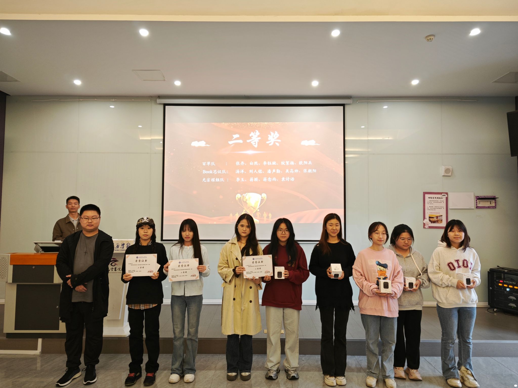 随着激昂且隆重的音乐声响起,获奖学生按奖项等级逐一登台,接受属于他们的荣誉。从优秀奖到三等奖、二等奖,再到令人瞩目的一等奖,每一次颁奖都伴随着热烈的掌声与欢呼,这是对他们辛勤付出和创新精神最真挚的赞誉和肯定。每一次名字的宣读都激起现场观众的热烈反响,为获奖者献上最热烈的祝贺。同时,为了表达对那些在幕后默默耕耘、无私奉献的教师们的深深敬意,本次大赛特别设立了“优秀指导教师奖”。这一奖项不仅是对他们智慧与辛勤付出的认可,更是向这些引领学生前行的导师们致以最崇高的敬意,以表彰他们为学生们的成长之路所做出的卓越贡献。