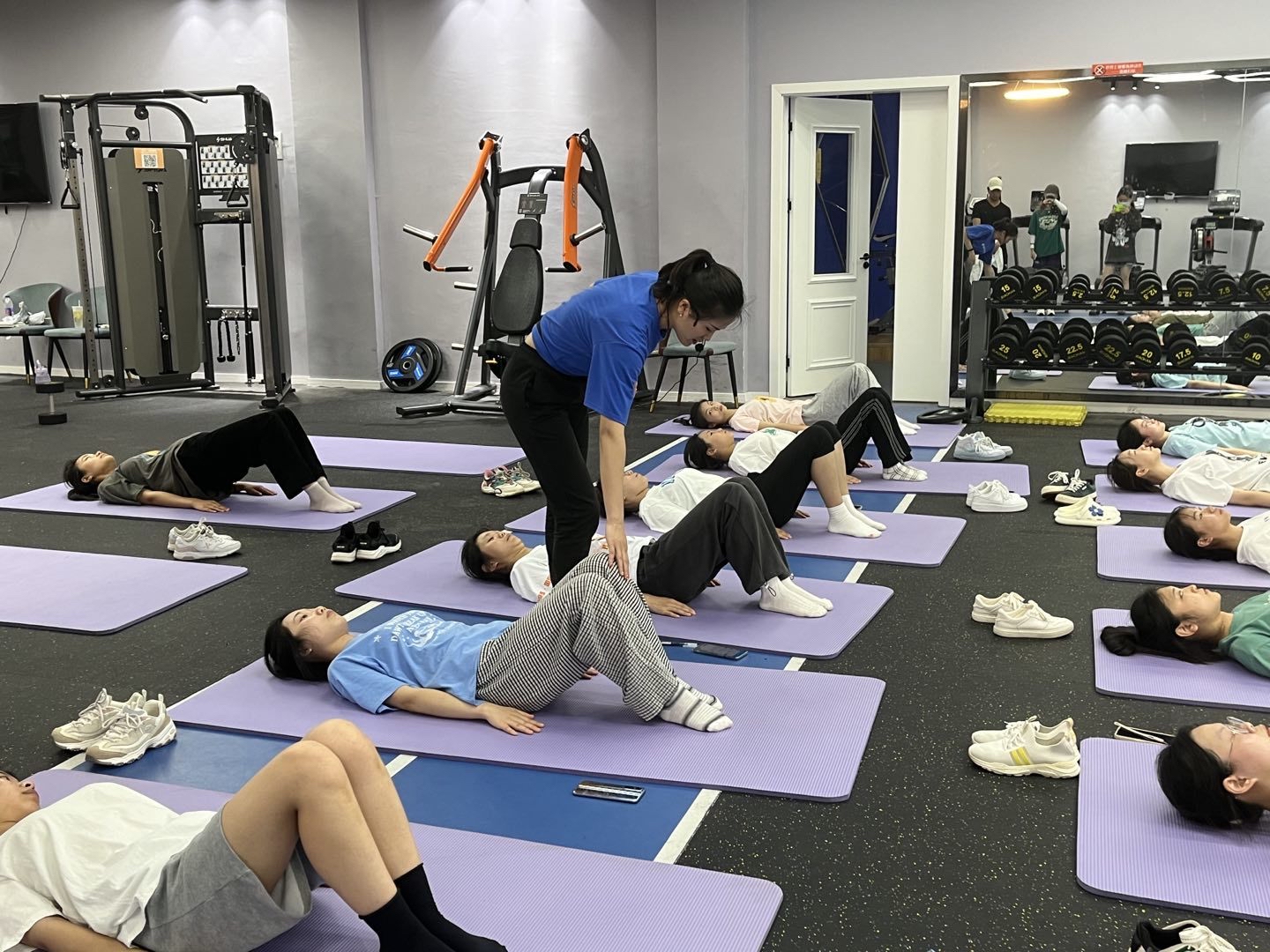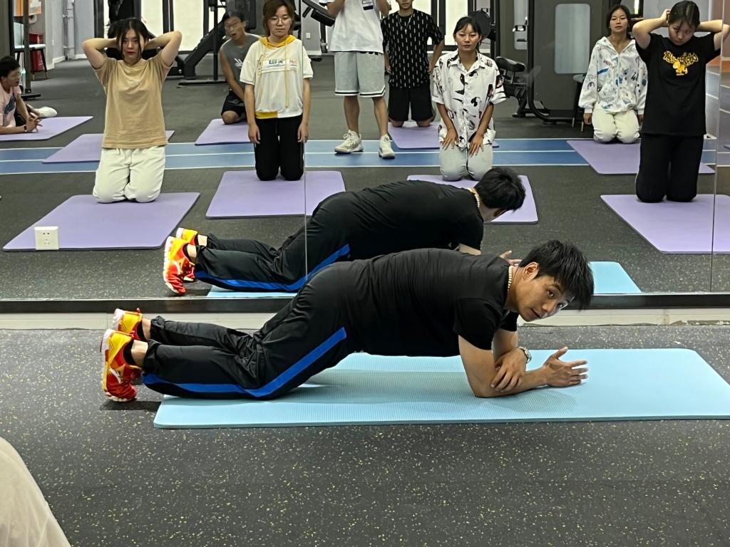 紧接着,课程步入正题,陈洋老师给大家讲解动作要领并示范,同学们都跟着积极练习,对于动作不标准的同学由老师进行一对一指导,俯卧交替摸肩、臀桥等动作不仅可以紧致肌肉,而且针对于同学们的久坐造成的腰部疲劳可以起到有效的缓解作用。在课程最后,陈洋老师给了大家一个“平板支撑”挑战赛,看大家谁可以坚持更长的时间,在极具动感的音乐下,所以同学们都激情澎湃,永争第一。我们可以看到即便满身汗水,大家都决不放弃,坚定信念。同学们表示在健身角能够得到老师的专业指导,能够和同学们一起锻炼是非常开心的,希望今后可以有更多的老师和同学参与其中,一起感受健身的魅力。