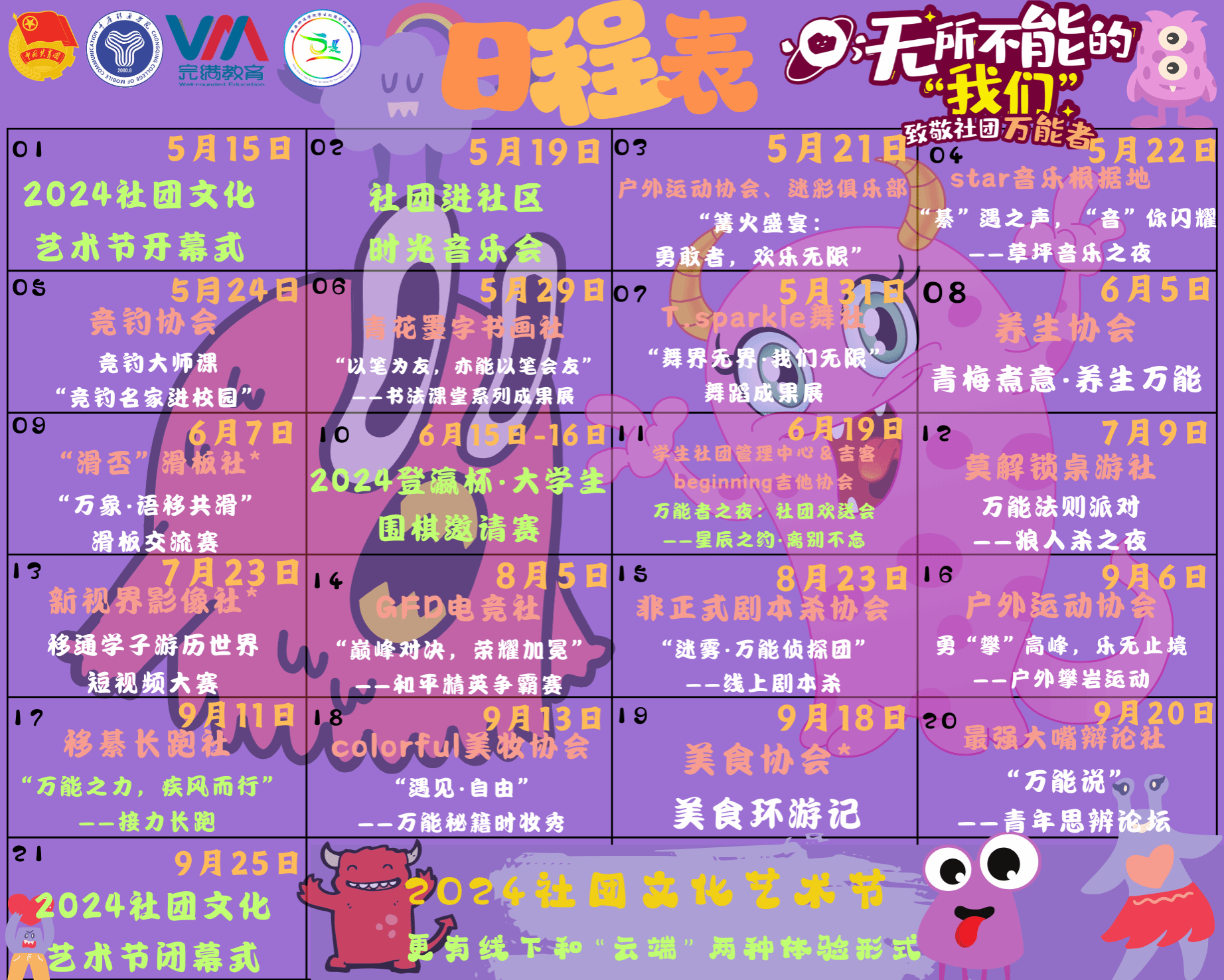 无所不能的“我们”是拥有无限潜能的万能者,是拥有旺盛生命力的完满移通er。在本次社团文化艺术节,同学们可以在社团活动中发现那些蕴含在自己身体里的神秘力量。你可以在“嗑瓜子但不吃比赛”中成为克制万能者,懂得“人生小满胜万全”的道理;可以在“闭眼原地踏步”中成为平衡万能者,不仅锻炼身体平衡力,也感悟“忙时有序,闲时有趣”平衡的生活状态;可以在“指压板跳绳”中成为忍耐万能者,忍得住一时的疼痛,才有机会赢得最后的胜利,就像人生之路忍而后宽;可以在“滑板冰壶”中成为协同万能者,与伙伴共赢,与社团万能者众行致远,共赴完满社团路;可以在“猜拳泼水”中成为敏捷万能者,成为“古希腊掌管反应力的神”,对机会的反应速度智慧只增不减。这趟奔赴成为万能者的旅程,让我们把奇迹紧握在自己手里!