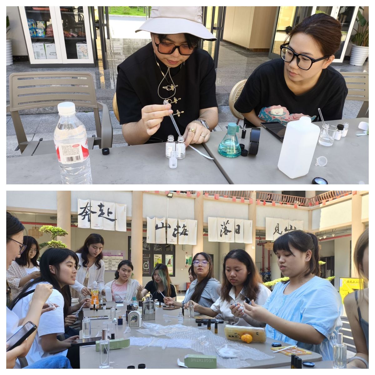 徐国栋老师为前来参加活动的同学们准备了一段调香之旅。以“人人都是调香师”为主题,为同学们带来香氛全新体验。徐老师在开始活动前,给大家介绍了调香的步奏,带领大家一起搞创作,调配属于自己的香味。大家纷纷开始挑选自己喜欢的香味调香试验及试香,确定准备制作的香型。开始自制香水时,选择主香称重,按照配方加入各种添加剂,选择颜色,最后搅拌成型,装瓶以后老师还给我们发了2ml的小样喷瓶,仪式感满满,开心、快乐有趣。徐老师说道,香水就像一张含蓄又特别的个人名片,希望同学们以后能成长为一位灵魂也有香气的人。