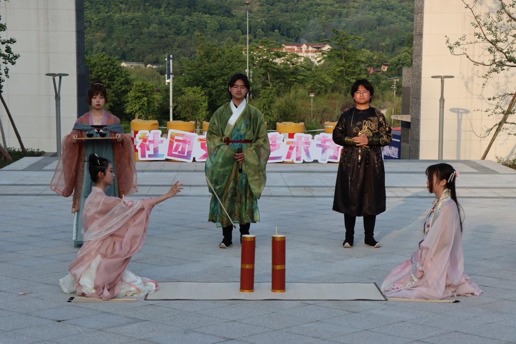 活动开始,古筝配乐响起,华韵汉服协会以走秀开场。伴随着优雅婉转的音乐,身着直裾、曲裾、齐胸襦裙等传统服装的表演者依次展开巡游,或柔静安逸、或典雅清新、或飘逸洒脱,汉服爱好者们身着各式霓裳欢聚一堂,共同展示传统文化之美。随后的投壶展演更是吸引了不少同学的目光,作为优秀中华传统体育项目,投壶展示出传统文化中的礼仪与分寸,让同学们了解古人是如何宴饮游乐的。