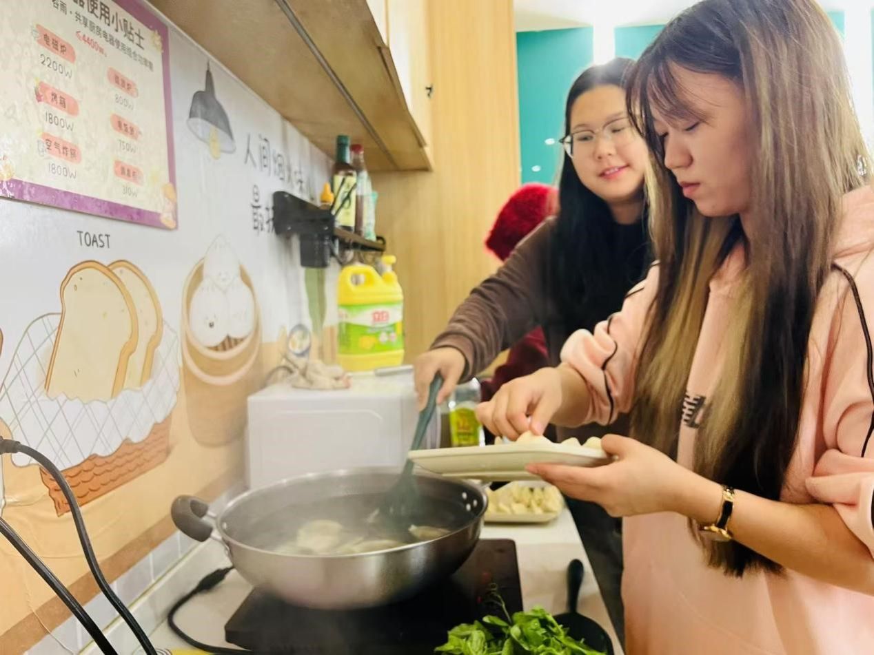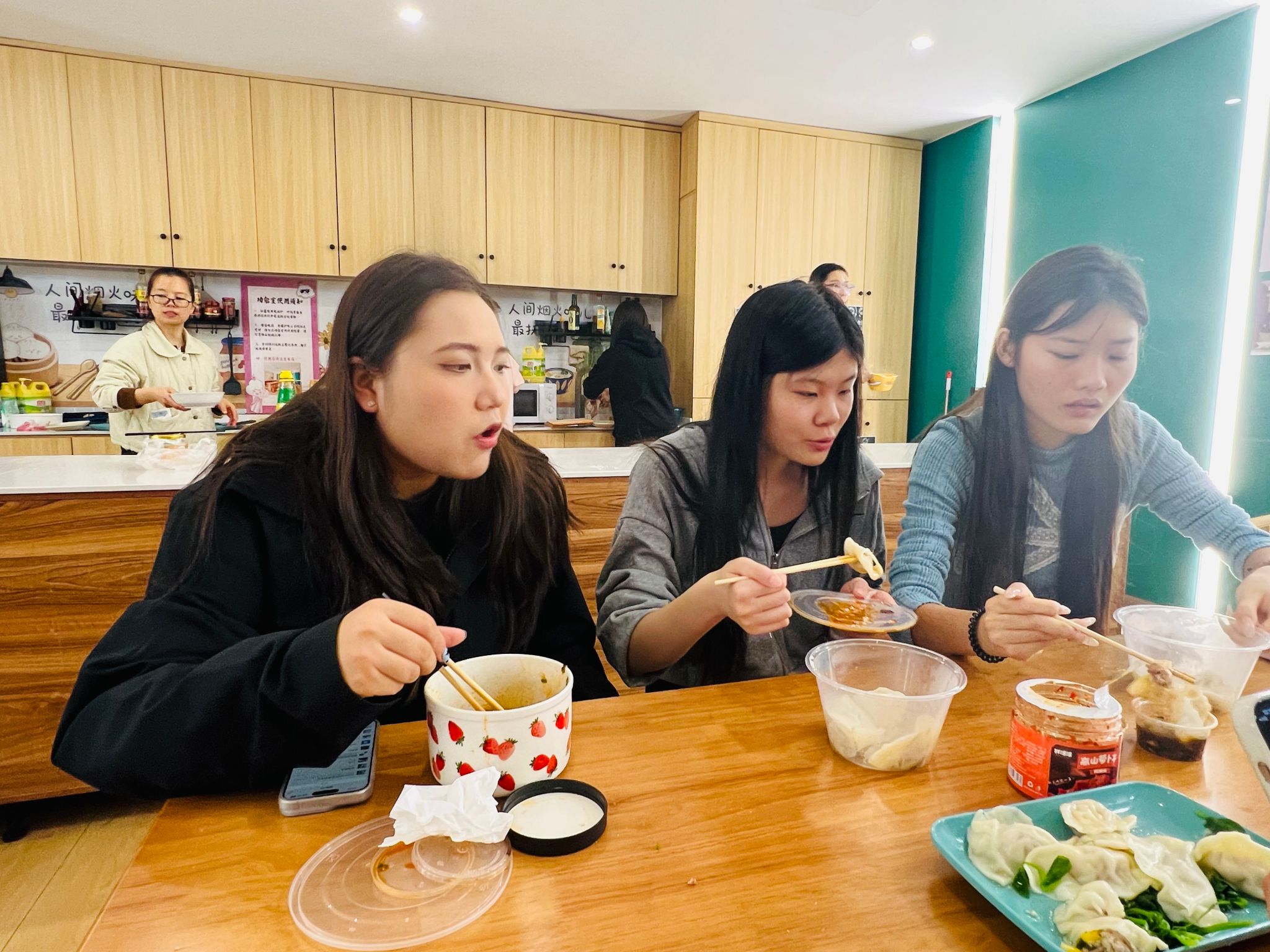 煮饺子、吃饺子环节更是精彩叠加,看着自己亲手包的饺子,大家都无比兴奋、无比自豪。当一盘盘热腾腾的饺子端上来时,同学们拿起碗和勺,大家吹着热气争先恐后品尝自己的劳动果实,品味自己亲手制作的食物带来的唇齿留香,幸福的笑容洋溢在每一位参与者的脸上。香味飘满了整个共享厨房,欢快的气氛回荡在校园的每个角落。
