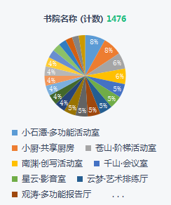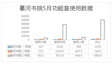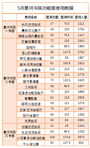 这个五月,綦河书院一、二、三号楼书院功能室共使用1476次,总使用时长2634小时,总使用人次为50810人次,平均每天使用约84.9小时,平均每天使用人次约1639人。在五一假期占掉了四分之一个月的情况下,綦河书院功能室的使用次数、时长都相较于上月大幅度增加,可见这是一个热闹的五月。
